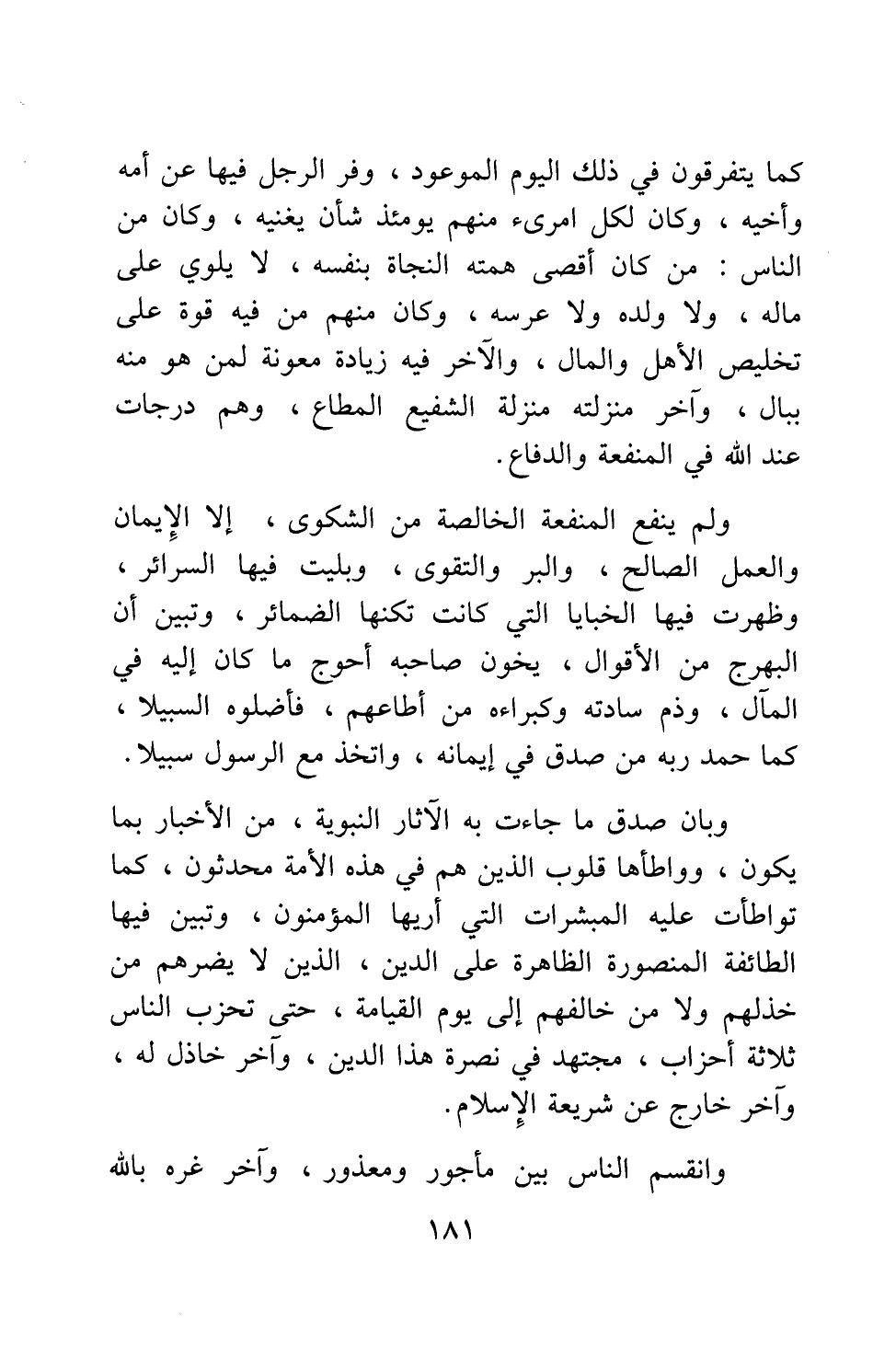 وبان صدق ما جاءت به الآثار النبوية، من الأخبار بما يكون، وواطأها قلوب الذين هم في هذه الأمة محدثون، كما تواطأت عليه المبشرات التي أريها المؤمنون، وتبين فيها الطائفة المنصورة الظاهرة على الدين، الذين لا يضرهم من خذلهم ولا من خالفهم إلى يوم القيامة، حتى تحزب الناس ثلاثة أحزاب: مجتهد في نصرة هذا الدين، وآخر خاذل له، وآخر خارج عن شريعة الإسلام. وانقسم الناس بين مأجور ومعذور، وآخر غره بالله
