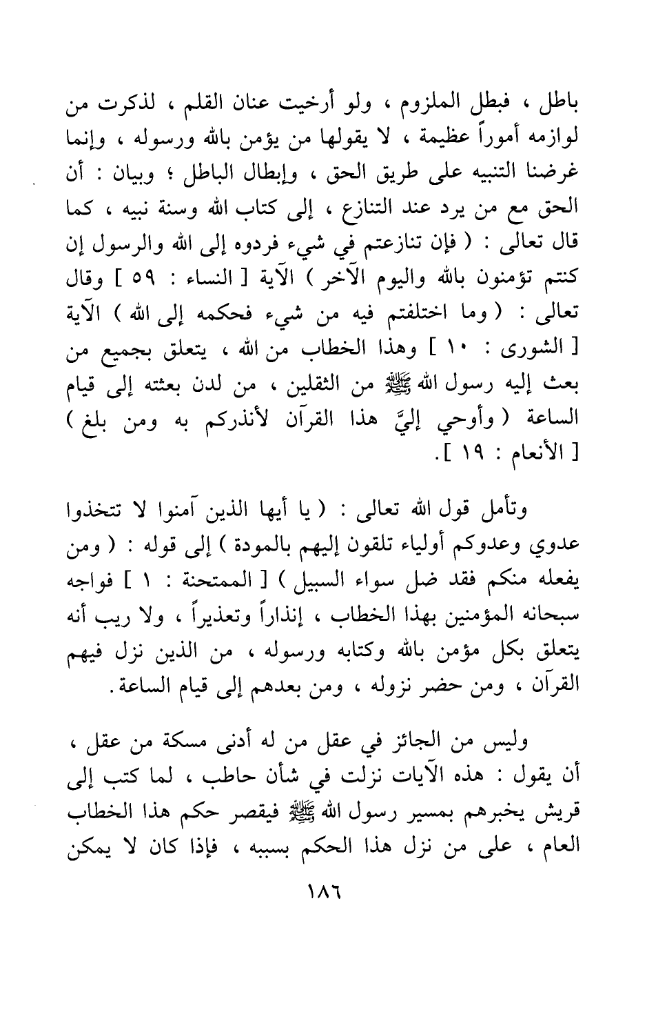 وليس من الجائز في عقل من له أدنى مسكة من عقل، أن يقول: هذه الآيات نزلت في شأن حاطب، لما كتب إلى قريش يخبرهم بمسير رسول الله صلى الله عليه وسلم، فيقصر حكم هذا الخطاب العام، على من نزل هذا الحكم بسببه. فإذا كان لا يمكن