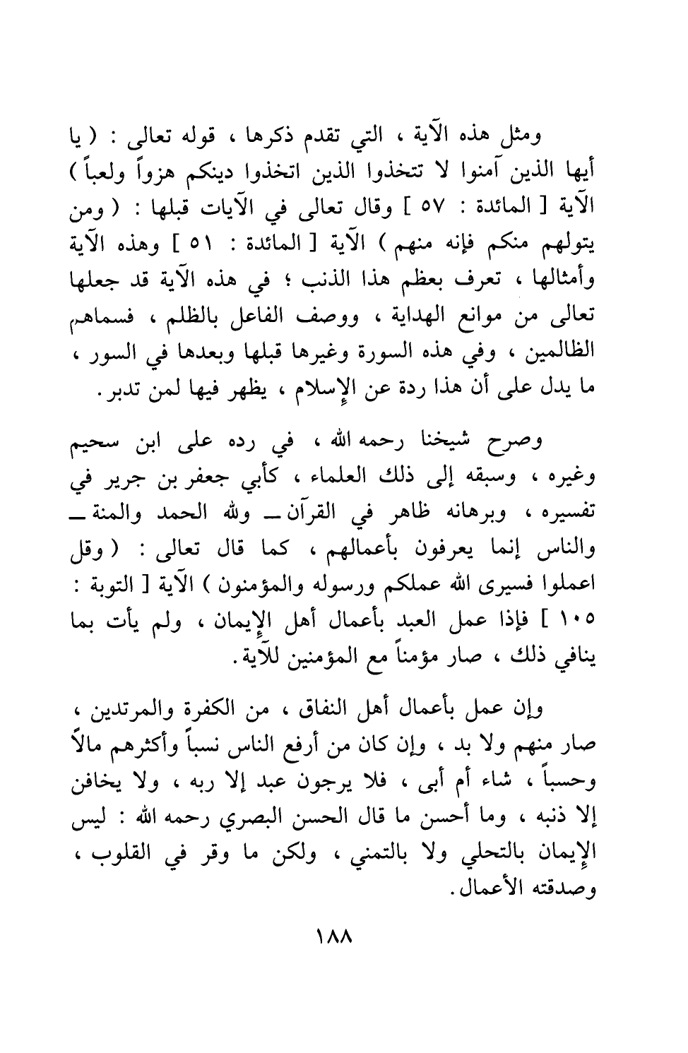 وصرح شيخنا، رحمه الله، في رده على ابن سحيم وغيره، وسبقه إلى ذلك العلماء، كأبي جعفر ابن جرير في تفسيره، وبرهانه ظاهر في القرآن - ولله الحمد والمنة - والناس إنما يعرفون بأعمالهم، كما قال تعالى: {وَقُلِ اعْمَلُوا فَسَيَرَى اللَّهُ عَمَلَكُمْ وَرَسُولُهُ وَالْمُؤْمِنُونَ} الآية [سورة التوبة آية: 105] . فإذا عمل العبد بأعمال أهل الإيمان، ولم يأت بما ينافي ذلك، صار مؤمناً مع المؤمنين للآية، وإن عمل بأعمال أهل النفاق، من الكفرة والمرتدين، صار منهم ولا بد، وإن كان من أرفع الناس نسباً وأكثرهم مالاً وحسباً، شاء أم أبى. فلا يرجونّ عبد إلا ربه، ولا يخافنّ إلا ذنبه، وما أحسن ما قال الحسن البصري، رحمه الله: "ليس الإيمان بالتحلي ولا بالتمني، ولكن ما وقر في القلوب، وصدقته الأعمال".