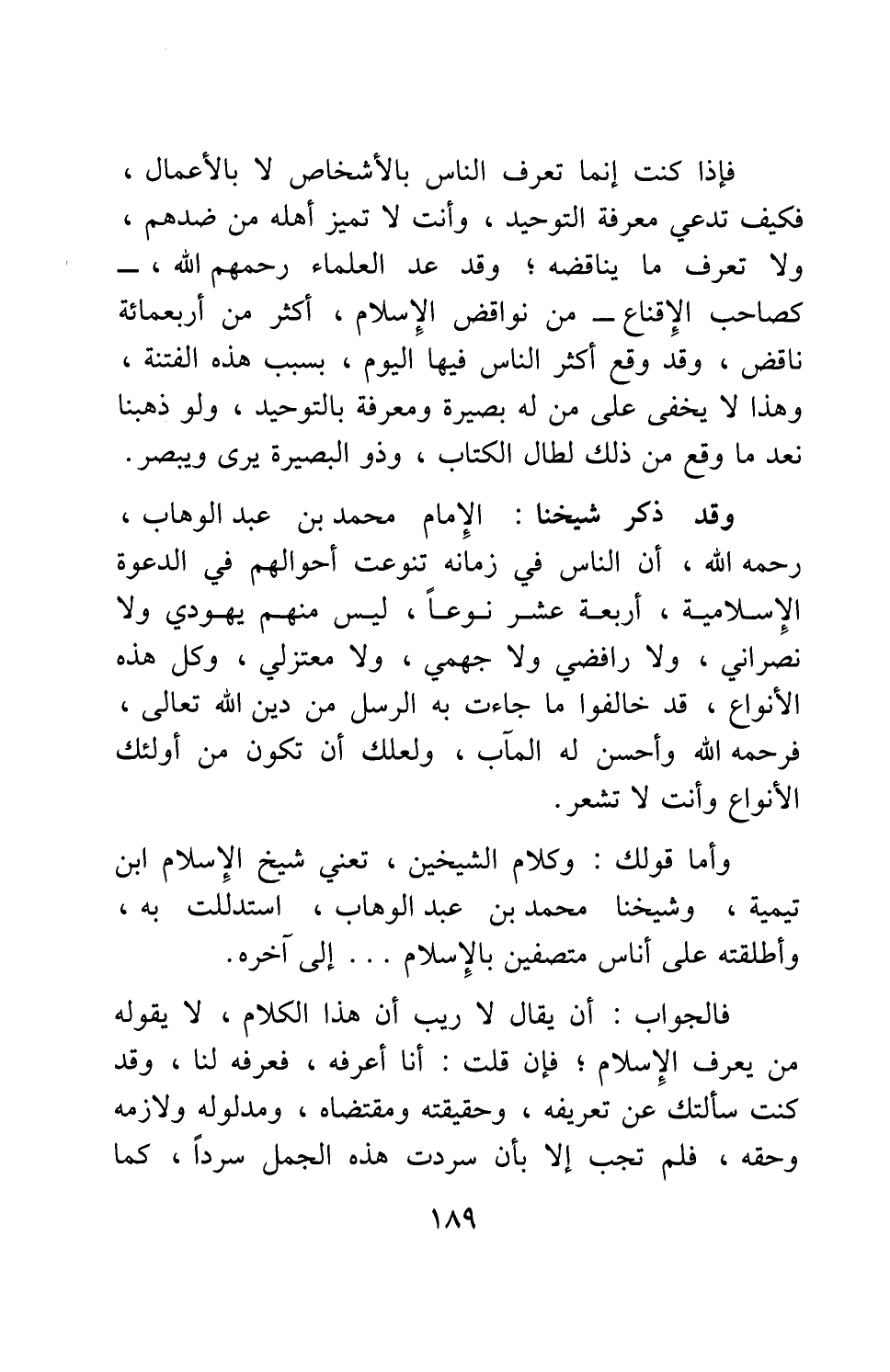 فإذا كنت إنما تعرف الناس بالأشخاص لا بالأعمال، فكيف تدعي معرفة التوحيد، وأنت لا تميز أهله من ضدهم، ولا تعرف ما يناقضه؟ وقد عد العلماء، رحمهم الله، - كصاحب الإقناع - من نواقض الإسلام أكثر من أربعمائة ناقض، وقد وقع أكثر الناس فيها اليوم، بسبب هذه الفتنة؛ وهذا لا يخفى على من له بصيرة ومعرفة بالتوحيد. ولو ذهبنا نعد ما وقع من ذلك لطال الكتاب، وذو البصيرة يرى ويبصر.