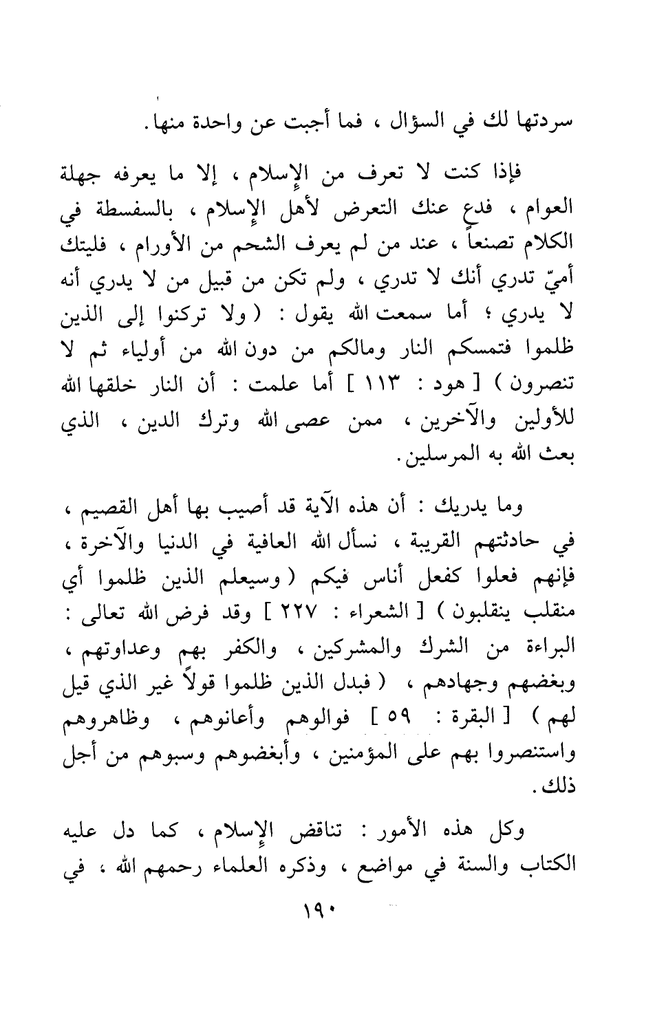وما يدريك أن هذه الآية قد أصيب بها أهل القصيم، في حادثتهم القريبة، نسأل الله العافية في الدنيا والآخرة؟ فإنهم فعلوا كفعل أناس فيكم، {وَسَيَعْلَمُ الَّذِينَ ظَلَمُوا أَيَّ مُنْقَلَبٍ يَنْقَلِبُونَ} [سورة الشعراء آية: 227] . وقد فرض الله تعالى البراءة من الشرك والمشركين، والكفر بهم وعداوتهم، وبغضهم وجهادهم، {فَبَدَّلَ الَّذِينَ ظَلَمُوا قَوْلاً غَيْرَ الَّذِي قِيلَ لَهُمْ} [سورة البقرة آية: 59] ، فوالوهم وأعانوهم، وظاهروهم واستنصروا بهم على المؤمنين، وأبغضوهم وسبوهم من أجل ذلك.