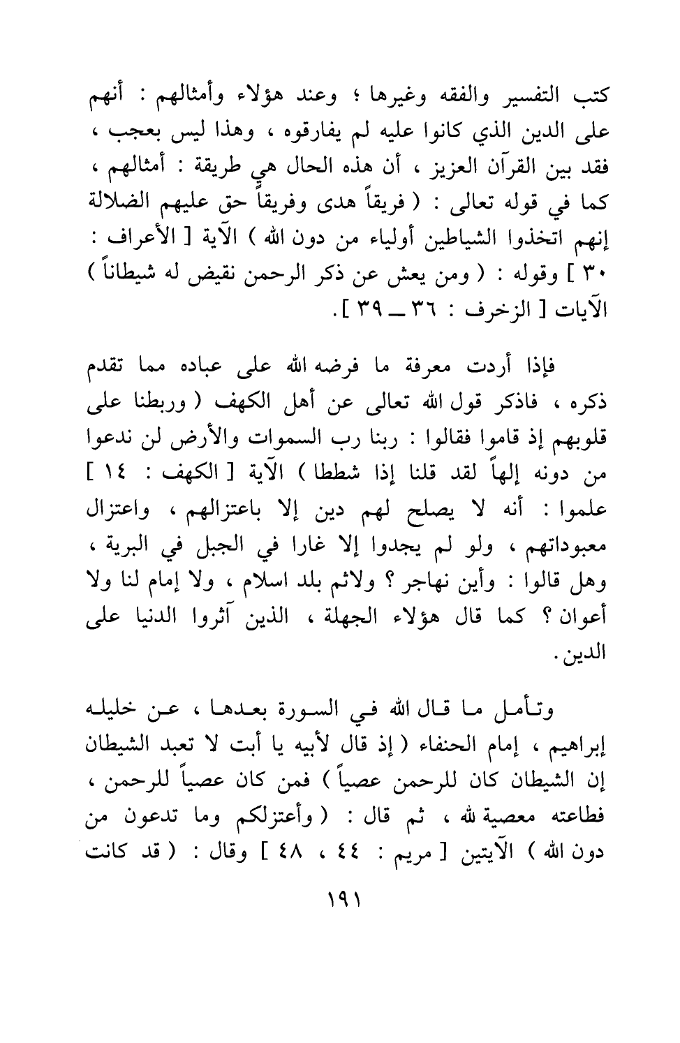 كتب التفسير والفقه وغيرها. وعند هؤلاء وأمثالهم أنهم على الدين الذي كانوا عليه لم يفارقوه، وهذا ليس بعجب، فقد بين القرآن العزيز، أن هذه الحال هي طريقة أمثالهم، كما في قوله تعالى: {فَرِيقاً هَدَى وَفَرِيقاً حَقَّ عَلَيْهِمُ الضَّلالَةُ إِنَّهُمُ اتَّخَذُوا الشَّيَاطِينَ أَوْلِيَاءَ مِنْ دُونِ اللَّهِ} الآية [سورة الأعراف آية: 30] ، وقوله: {وَمَنْ يَعْشُ عَنْ ذِكْرِ الرَّحْمَنِ نُقَيِّضْ لَهُ شَيْطَاناً} الآيات [سورة الزخرف آية: 36] . فإذا أردت معرفة ما فرضه الله على عباده مما تقدم ذكره، فاذكر قول الله تعالى عن أهل الكهف: {وَرَبَطْنَا عَلَى قُلُوبِهِمْ إِذْ قَامُوا فَقَالُوا رَبُّنَا رَبُّ السَّمَاوَاتِ وَالْأَرْضِ لَنْ نَدْعُوَ مِنْ دُونِهِ إِلَهاً لَقَدْ قُلْنَا إِذاً شَطَطاً} الآية [سورة الكهف آية: 14] ، علموا أنه لا يصلح لهم دين إلا باعتزالهم، واعتزال معبوداتهم، ولو لم يجدوا إلا غاراً في الجبل في البرية، وهل قالوا: وأين نهاجر؟ ولا ثمَّ بلد إسلام، ولا إمام لنا ولا أعوان، كما قال هؤلاء الجهلة، الذين آثروا الدنيا على الدين. وتأمل ما قال الله في السورة بعدها عن خليله إبراهيم، إمام الحنفاء: {يَا أَبَتِ إِنِّي قَدْ جَاءَنِي مِنَ الْعِلْمِ مَا لَمْ يَأْتِكَ فَاتَّبِعْنِي أَهْدِكَ صِرَاطاً سَوِيّاً يَا أَبَتِ لا تَعْبُدِ الشَّيْطَانَ إِنَّ الشَّيْطَانَ كَانَ لِلرَّحْمَنِ عَصِيّاً} [سورة مريم آية: 43-44] ؛ فمن كان عصياً للرحمن، فطاعته معصية لله. ثم قال: {وَأَعْتَزِلُكُمْ وَمَا تَدْعُونَ مِنْ دُونِ اللَّهِ} الآيتين [سورة مريم آية: 48] ، وقال: {قَدْ كَانَتْ