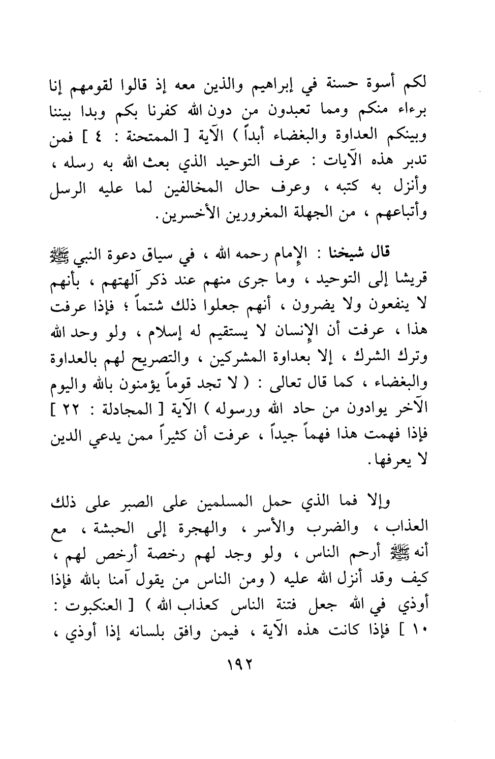 قال شيخنا الإمام، رحمه الله، في سياق دعوة النبي صلى الله عليه وسلم قريشاً إلى التوحيد، وما جرى منهم عند ذكر آلهتهم، بأنهم لا ينفعون ولا يضرون، أنهم جعلوا ذلك شتماً. فإذا عرفت هذا، عرفت أن الإنسان لا يستقيم له إسلام، ولو وحد الله وترك الشرك، إلا بعداوة المشركين، والتصريح لهم بالعداوة والبغضاء، كما قال تعالى: {لا تَجِدُ قَوْماً يُؤْمِنُونَ بِاللَّهِ وَالْيَوْمِ الْآخِرِ يُوَادُّونَ مَنْ حَادَّ اللَّهَ وَرَسُولَهُ} الآية [سورة المجادلة آية: 22] . فإذا فهمت هذا فهماً جيداً، عرفت أن كثيراً ممن يدعي الدين لا يعرفها. وإلا فما الذي حمل المسلمين على الصبر على ذلك العذاب، والضرب والأسر، والهجرة إلى الحبشة؟ مع أنه صلى الله عليه وسلم أرحم الناس، ولو وجد لهم رخصة أرخص لهم، كيف وقد أنزل الله عليه: {وَمِنَ النَّاسِ مَنْ يَقُولُ آمَنَّا بِاللَّهِ فَإِذَا أُوذِيَ فِي اللَّهِ جَعَلَ فِتْنَةَ النَّاسِ كَعَذَابِ اللَّهِ} [سورة العنكبوت آية: 10] . فإذا كانت هذه الآية فيمن وافق بلسانه إذا أوذي،