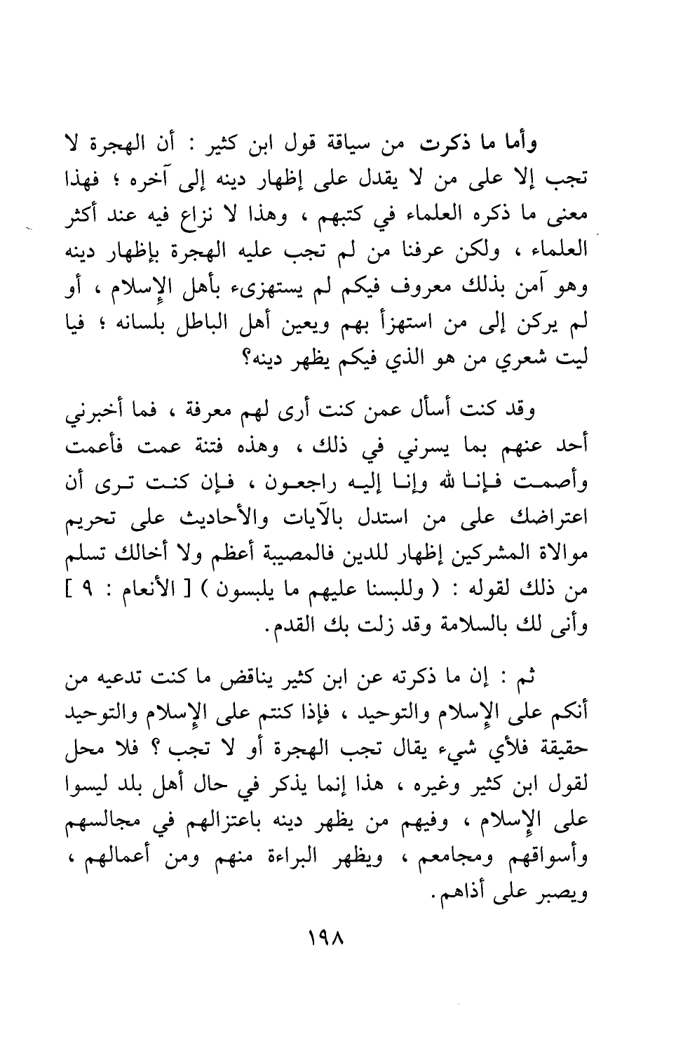 وأما ما ذكرت من سياقة قول ابن كثير: أن الهجرة لا تجب إلا على من لا يقدر على إظهار دينه ... إلخ، فهذا معنى ما ذكره العلماء في كتبهم، وهذا لا نزاع فيه عند أكثر العلماء؛ ولكن عرفنا من لم تجب عليه الهجرة بإظهار دينه وهو آمن بذلك، معروف فيكم لم يستهزئ بأهل الإسلام، أو لم يركن إلى من استهزأ بهم، ويعين أهل الباطل بلسانه; فيا ليت شعري من هو الذي فيكم يظهر دينه؟