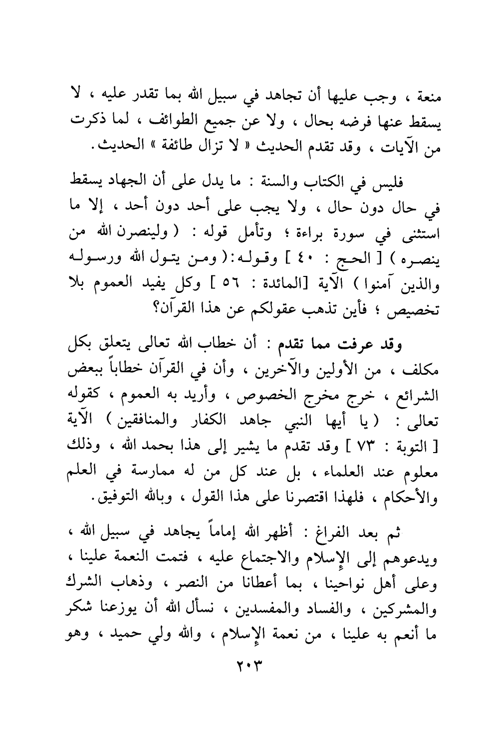 فليس في الكتاب والسنة ما يدل على أن الجهاد يسقط في حال دون حال، ولا يجب على أحد دون أحد، إلا ما استثنى في سورة براءة. وتأمل قوله: {وَلَيَنْصُرَنَّ اللَّهُ مَنْ يَنْصُرُهُ إ} [سورة الحج آية: 40] ، وقوله: {وَمَنْ يَتَوَلَّ اللَّهَ وَرَسُولَهُ وَالَّذِينَ آمَنُوا} الآية [سورة المائدة آية: 56] ؛ وكل يفيد العموم بلا تخصيص. فأين تذهب عقولكم عن هذا القرآن؟