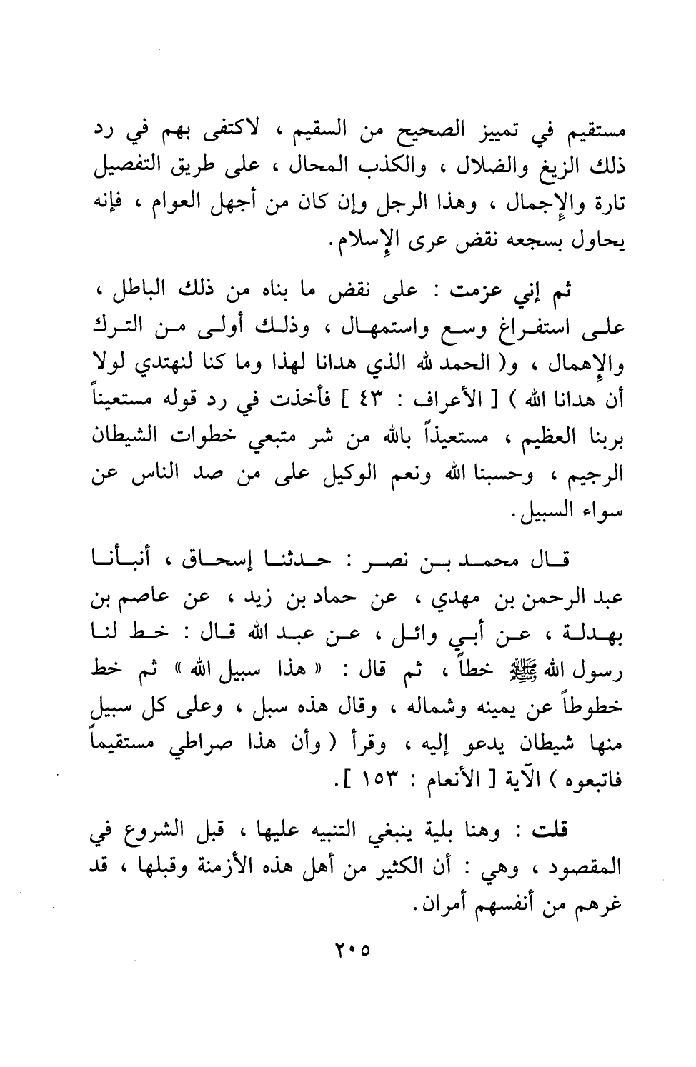 قال محمد بن نصر: حدثنا إسحاق، أنبأنا عبد الرحمن بن مهدي، عن حماد بن زيد، عن عاصم بن بهدلة، عن أبي وائل، عن عبد الله قال: " خط لنا رسول الله صلى الله عليه وسلم خطاً، ثم قال: هذا سبيل الله. ثم خط خطوطاً عن يمينه وشماله، وقال: هذه سبل، وعلى كل سبيل منها شيطان يدعو إليه. وقرأ {وَأَنَّ هَذَا صِرَاطِي مُسْتَقِيماً فَاتَّبِعُوهُ} 1") الآية.