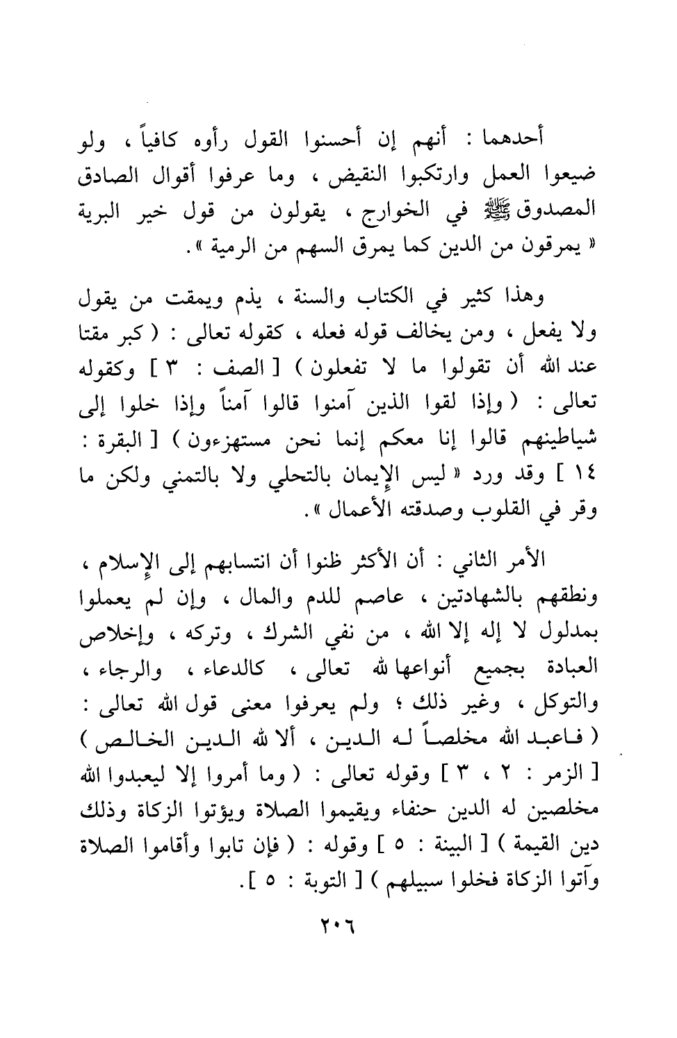 أحدهما: أنهم إن أحسنوا القول رأوه كافياً، ولو ضيعوا العمل وارتكبوا النقيض، وما عرفوا أقوال الصادق المصدوق صلى الله عليه وسلم في الخوارج: " يقولون من قول خير البرية، يمرقون من الدين كما يمرق السهم من الرمية " 1، وهذا كثير في الكتاب والسنة، يذم ويمقت من يقول ولا يفعل، ومن يخالف قوله فعله، كقوله تعالى: {كَبُرَ مَقْتاً عِنْدَ اللَّهِ أَنْ تَقُولُوا مَا لا تَفْعَلُونَ} [سورة الصف آية: 3] ، وكقوله تعالى: {وَإِذَا لَقُوا الَّذِينَ آمَنُوا قَالُوا آمَنَّا وَإِذَا خَلَوْا إِلَى شَيَاطِينِهِمْ قَالُوا إِنَّا مَعَكُمْ إِنَّمَا نَحْنُ مُسْتَهْزِئُونَ} [سورة البقرة آية: 14] . وقد ورد: "ليس الإيمان بالتحلي ولا بالتمني، ولكن ما وقر في القلوب، وصدقته الأعمال".