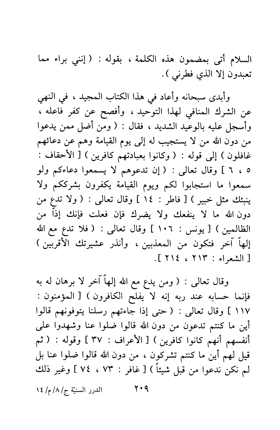 وأبدى سبحانه وأعاد في هذا الكتاب المجيد، في النهي عن الشرك المنافي لهذا التوحيد، وأفصح عن كفر فاعله، وأسجل عليه بالوعيد الشديد، فقال: {وَمَنْ أَضَلُّ مِمَّنْ يَدْعُو مِنْ دُونِ اللَّهِ مَنْ لا يَسْتَجِيبُ لَهُ إِلَى يَوْمِ الْقِيَامَةِ وَهُمْ عَنْ دُعَائِهِمْ غَافِلُونَ} [سورة الأحقاف آية: 5] إلى قوله: {وَكَانُوا بِعِبَادَتِهِمْ كَافِرِينَ} [سورة الأحقاف آية: 6] ، وقال تعالى: {إِنْ تَدْعُوهُمْ لا يَسْمَعُوا دُعَاءَكُمْ وَلَوْ سَمِعُوا مَا اسْتَجَابُوا لَكُمْ وَيَوْمَ الْقِيَامَةِ يَكْفُرُونَ بِشِرْكِكُمْ وَلا يُنَبِّئُكَ مِثْلُ خَبِيرٍ} [سورة فاطر آية: 14] ، وقال تعالى: {وَلا تَدْعُ مِنْ دُونِ اللَّهِ مَا لا يَنْفَعُكَ وَلا يَضُرُّكَ فَإِنْ فَعَلْتَ فَإِنَّكَ إِذاً مِنَ الظَّالِمِينَ} [سورة يونس آية: 106] ، وقال تعالى: {فَلا تَدْعُ مَعَ اللَّهِ إِلَهاً آخَرَ فَتَكُونَ مِنَ الْمُعَذَّبِينَ وَأَنْذِرْ عَشِيرَتَكَ الْأَقْرَبِينَ} [سورة الشعراء آية: 213-214] . وقال تعالى: {وَمَنْ يَدْعُ مَعَ اللَّهِ إِلَهاً آخَرَ لا بُرْهَانَ لَهُ بِهِ فَإِنَّمَا حِسَابُهُ عِنْدَ رَبِّهِ إِنَّهُ لا يُفْلِحُ الْكَافِرُونَ} [سورة المؤمنون آية: 117] ، وقال تعالى: {حَتَّى إِذَا جَاءَتْهُمْ رُسُلُنَا يَتَوَفَّوْنَهُمْ قَالُوا أَيْنَ مَا كُنْتُمْ تَدْعُونَ مِنْ دُونِ اللَّهِ قَالُوا ضَلُّوا عَنَّا وَشَهِدُوا عَلَى أَنْفُسِهِمْ أَنَّهُمْ كَانُوا كَافِرِينَ} [سورة الأعراف آية: 37] ، وقوله: {ثُمَّ قِيلَ لَهُمْ أَيْنَ مَا كُنْتُمْ تُشْرِكُونَ مِنْ دُونِ اللَّهِ قَالُوا ضَلُّوا عَنَّا بَلْ لَمْ نَكُنْ نَدْعُوا مِنْ قَبْلُ شَيْئاً} [سورة غافر آية: 73-74] ، وغير ذلك
