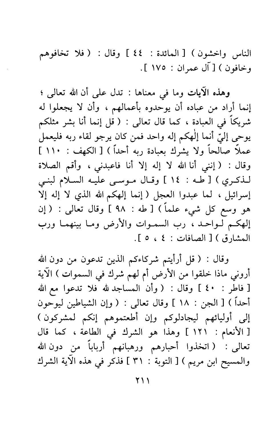 وهذه الآيات وما في معناها تدل على أن الله تعالى إنما أراد من عباده أن يوحدوه بأعمالهم، وأن لا يجعلوا له شريكاً في العبادة، كما قال تعالى: {قُلْ إِنَّمَا أَنَا بَشَرٌ مِثْلُكُمْ يُوحَى إِلَيَّ أَنَّمَا إِلَهُكُمْ إِلَهٌ وَاحِدٌ فَمَنْ كَانَ يَرْجُوا لِقَاءَ رَبِّهِ فَلْيَعْمَلْ عَمَلاً صَالِحاً وَلا يُشْرِكْ بِعِبَادَةِ رَبِّهِ أَحَداً} [سورة الكهف آية: 110] ، وقال: {إِنَّنِي أَنَا اللَّهُ لا إِلَهَ إِلَّا أَنَا فَاعْبُدْنِي وَأَقِمِ الصَّلاةَ لِذِكْرِي} [سورة طه آية: 14] ، وقال موسى عليه السلام لبني إسرائيل، لما عبدوا العجل: {إِنَّمَا إِلَهُكُمُ اللَّهُ الَّذِي لا إِلَهَ إِلَّا هُوَ وَسِعَ كُلَّ شَيْءٍ عِلْماً} [سورة طه آية: 98] ، وقال تعالى: {إِنَّ إِلَهَكُمْ لَوَاحِدٌ رَبُّ السَّمَاوَاتِ وَالْأَرْضِ وَمَا بَيْنَهُمَا وَرَبُّ الْمَشَارِقِ} [سورة الصافات آية: 4-5] . وقال: {قُلْ أَرَأَيْتُمْ شُرَكَاءَكُمُ الَّذِينَ تَدْعُونَ مِنْ دُونِ اللَّهِ أَرُونِي مَاذَا خَلَقُوا مِنَ الْأَرْضِ أَمْ لَهُمْ شِرْكٌ فِي السَّمَاوَاتِ} الآية [سورة فاطر آية: 40] ، وقال: {وَأَنَّ الْمَسَاجِدَ لِلَّهِ فَلا تَدْعُو مَعَ اللَّهِ أَحَداً} [سورة الجن آية: 18] ، وقال تعالى: {وَإِنَّ الشَّيَاطِينَ لَيُوحُونَ إِلَى أَوْلِيَائِهِمْ لِيُجَادِلُوكُمْ وَإِنْ أَطَعْتُمُوهُمْ إِنَّكُمْ لَمُشْرِكُونَ} [سورة الأنعام آية: 121] ، وهذا هو الشرك في الطاعة، كما قال تعالى: {اتَّخَذُوا أَحْبَارَهُمْ وَرُهْبَانَهُمْ أَرْبَاباً مِنْ دُونِ اللَّهِ وَالْمَسِيحَ ابْنَ مَرْيَمَ} [سورة التوبة آية: 31] ، فذكر في هذه الآية الشرك