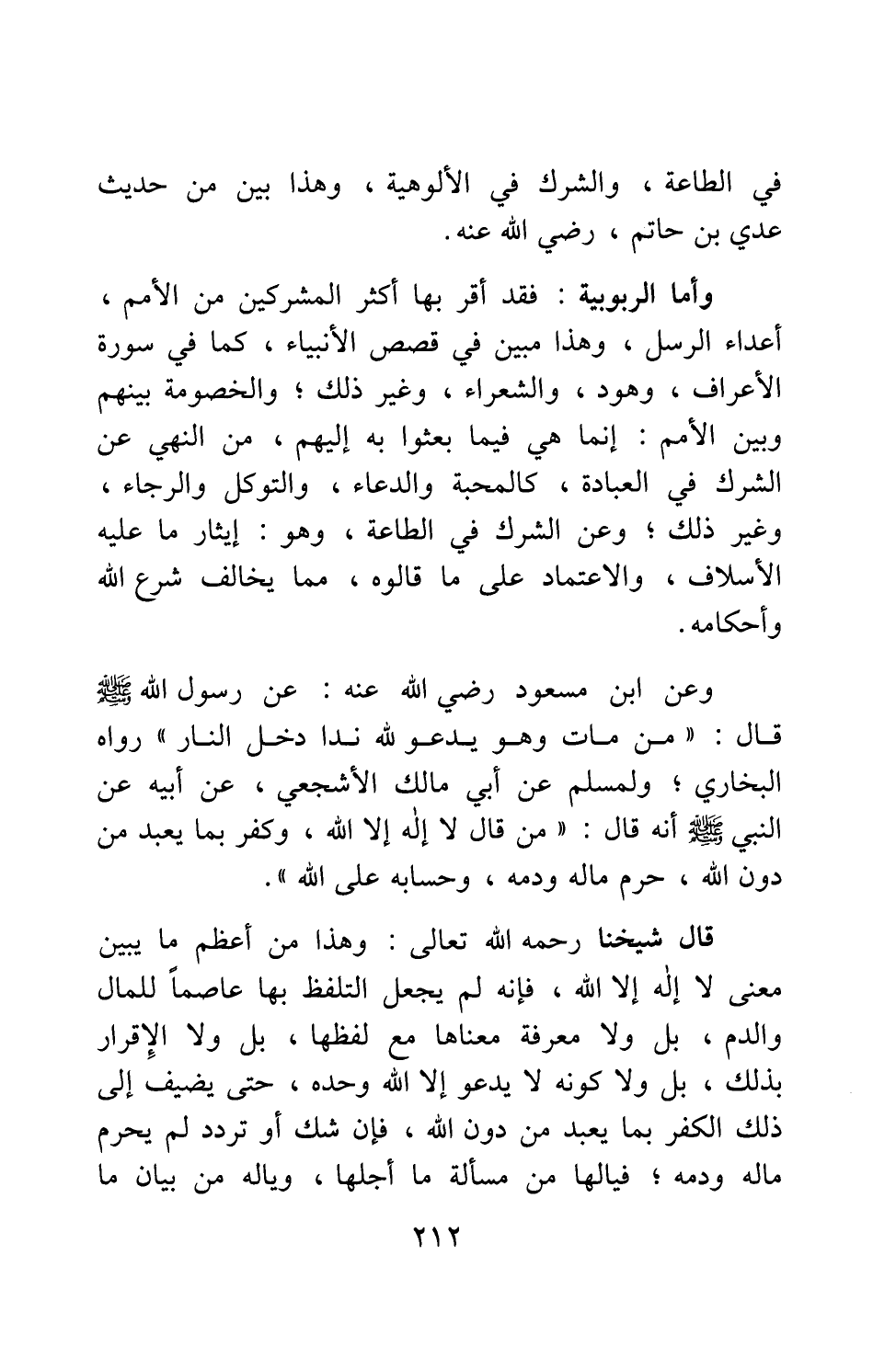 وعن ابن مسعود رضي الله عنه، عن رسول الله صلى الله عليه وسلم قال: " من مات وهو يدعو لله نداً، دخل النار " 1، رواه البخاري. ولمسلم عن أبي مالك الأشجعي، عن أبيه، عن النبي صلى الله عليه وسلم أنه قال: " من قال: لا إله إلا الله، وكفر بما يعبد من دون الله، حرم ماله ودمه؛ وحسابه على الله " 2.