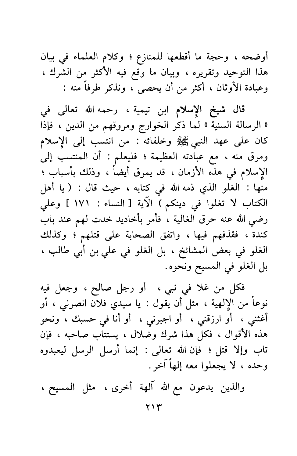 أوضحه! وحجة ما أقطعها للمنازع! وكلام العلماء في بيان هذا التوحيد وتقريره، وبيان ما وقع فيه الأكثر من الشرك وعبادة الأوثان، أكثر من أن يحصى. ونذكر طرفاً منه: