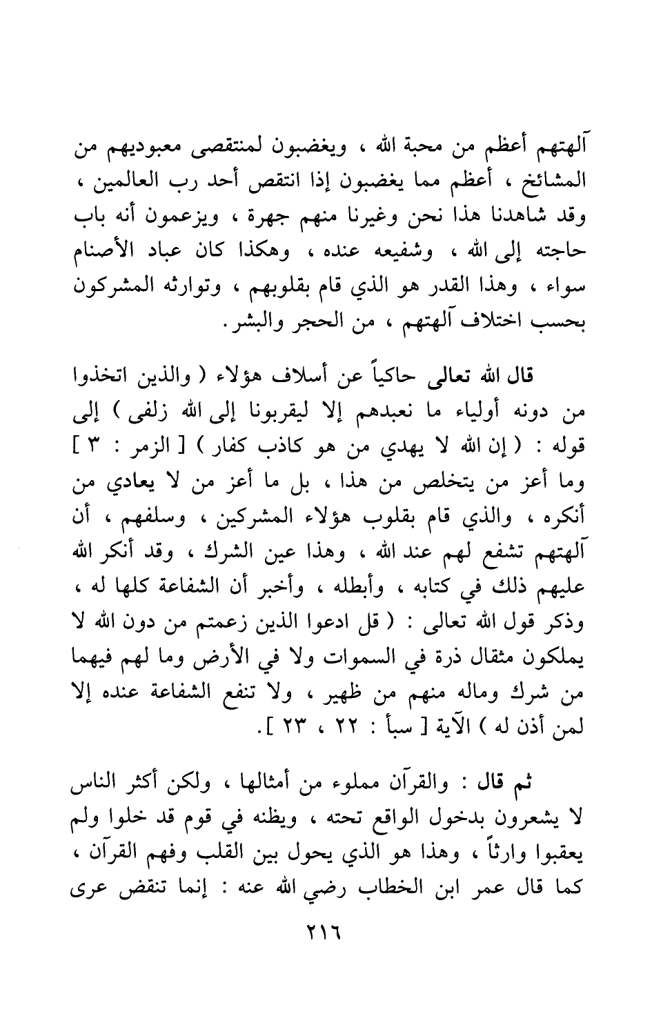 قال الله تعالى حاكياً عن أسلاف هؤلاء: {وَالَّذِينَ اتَّخَذُوا مِنْ دُونِهِ أَوْلِيَاءَ مَا نَعْبُدُهُمْ إِلَّا لِيُقَرِّبُونَا إِلَى اللَّهِ زُلْفَى} إلى قوله: {إِنَّ اللَّهَ لا يَهْدِي مَنْ هُوَ كَاذِبٌ كَفَّارٌ} [سورة الزمر آية: 3] . وما أعز من يتخلص من هذا! بل ما أعز من لا يعادي من أنكره! والذي قام بقلوب هؤلاء المشركين، وسلفهم: أن آلهتهم تشفع لهم عند الله، وهذا عين الشرك؛ وقد أنكر الله عليهم ذلك في كتابه، وأبطله، وأخبر أن الشفاعة كلها له، وذكر قول الله تعالى: {قُلِ ادْعُوا الَّذِينَ زَعَمْتُمْ مِنْ دُونِ اللَّهِ لا يَمْلِكُونَ مِثْقَالَ ذَرَّةٍ فِي السَّمَاوَاتِ وَلا فِي الْأَرْضِ وَمَا لَهُمْ فِيهِمَا مِنْ شِرْكٍ وَمَا لَهُ مِنْهُمْ مِنْ ظَهِيرٍ وَلا تَنْفَعُ الشَّفَاعَةُ عِنْدَهُ إِلَّا لِمَنْ أَذِنَ لَهُ} الآية [سورة سبأ آية: 22-23] .