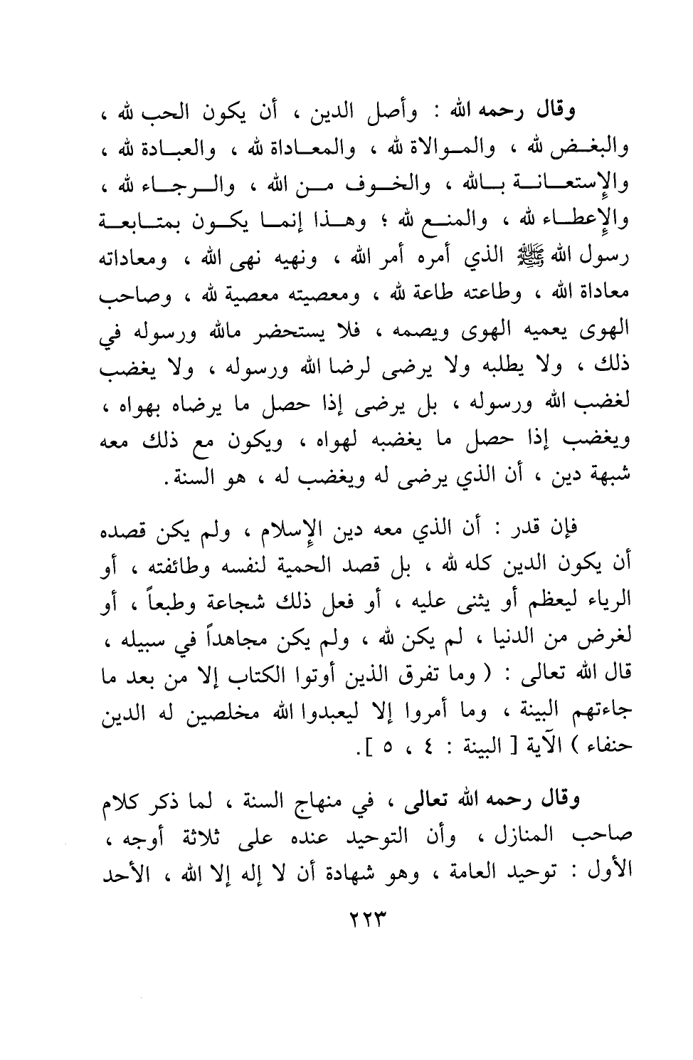 وقال، رحمه الله: وأصل الدين: أن يكون الحب لله، والبغض لله، والموالاة لله، والمعاداة لله، والعبادة لله، والاستعانة بالله، والخوف من الله، والرجاء لله، والإعطاء لله، والمنع لله؛ وهذا إنما يكون بمتابعة رسول الله صلى الله عليه وسلم الذي أمره أمر الله، ونهيه نهي الله، ومعاداته معاداة لله، وطاعته طاعة لله، ومعصيته معصية لله. وصاحب الهوى يعميه الهوى ويصمه، فلا يستحضر ما لله ورسوله في ذلك ولا يطلبه، ولا يرضى لرضى الله ورسوله، ولا يغضب لغضب الله ورسوله، بل يرضى إذا حصل ما يرضاه بهواه، ويغضب إذا حصل ما يغضبه لهواه، ويكون مع ذلك معه شبهة دين، أن الذي يرضى له ويغضب له، هو السنة.