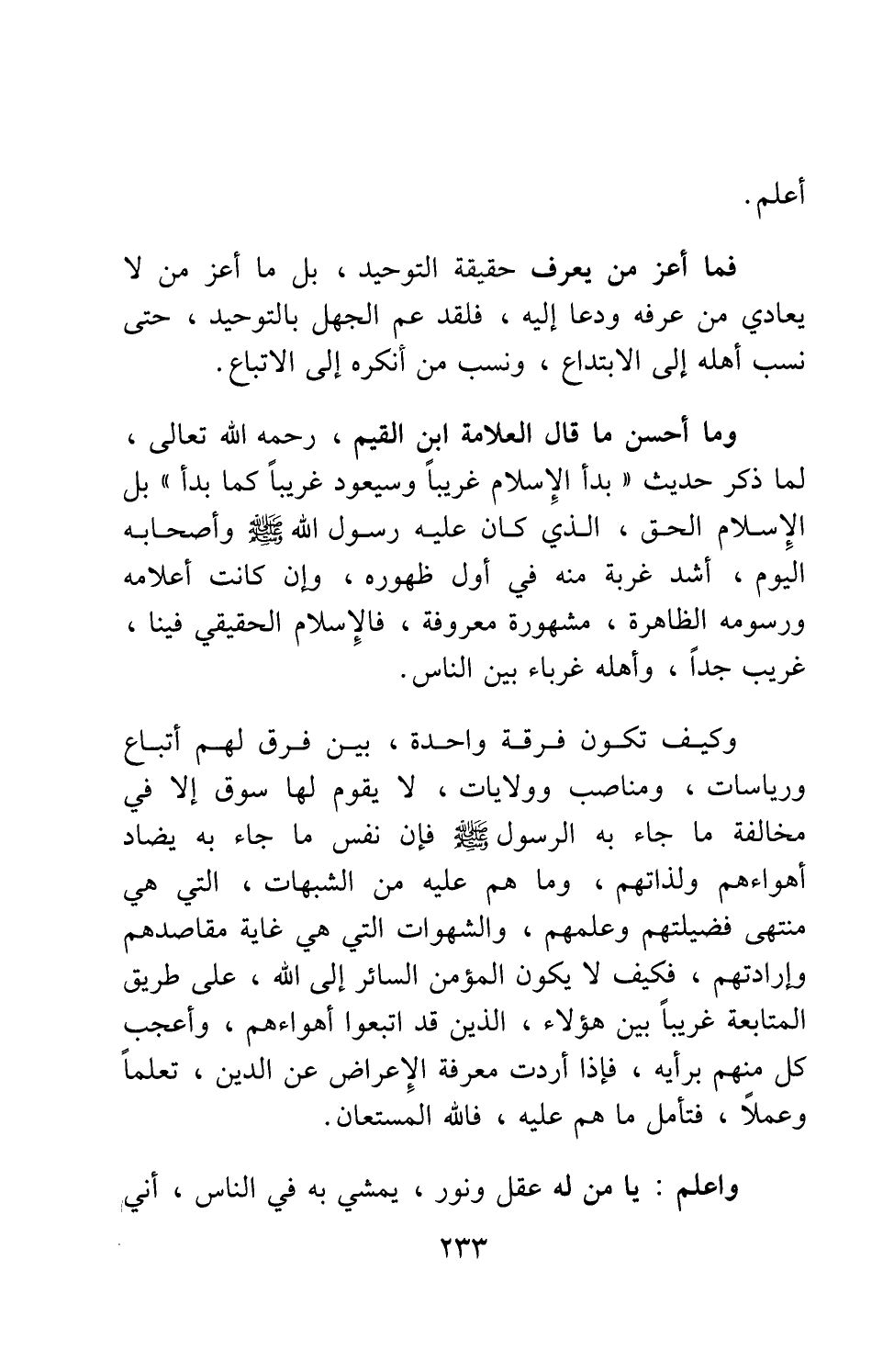 فما أعز من يعرف حقيقة التوحيد! بل ما أعز من لا يعادي من عرفه ودعا إليه! فلقد عم الجهل بالتوحيد، حتى نسب أهله إلى الابتداع ونسب من أنكره إلى الاتباع. وما أحسن ما قال العلامة ابن القيم، رحمه الله تعالى، لما ذكر حديث: " بدأ الإسلام غريباً، وسيعود غريباً كما بدأ " 1؛ بل الإسلام الحق، الذي كان عليه رسول الله صلى الله عليه وسلم وأصحابه اليوم، أشد غربة منه في أول ظهوره، وإن كانت أعلامه ورسومه الظاهرة، مشهورة معروفة، فالإسلام الحقيقي فينا غريب جداً، وأهله غرباء بين الناس.