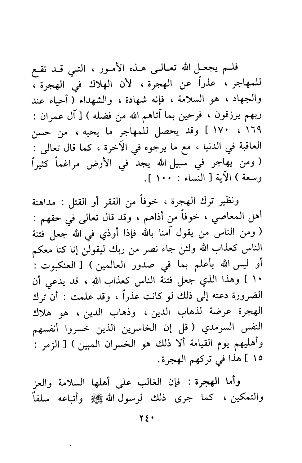 فلم يجعل الله تعالى هذه الأمور التي قد تقع للمهاجر، عذراً عن الهجرة، لأن الهلاك في الهجرة والجهاد هو السلامة، فإنه شهادة، والشهداء {أَحْيَاءٌ عِنْدَ رَبِّهِمْ يُرْزَقُونَ فَرِحِينَ بِمَا آتَاهُمُ اللَّهُ مِنْ فَضْلِهِ} [سورة آل عمران آية: 169-170] . وقد يحصل للمهاجر ما يحبه، من حسن العاقبة في الدنيا، مع ما يرجوه في الآخرة، كما قال تعالى: {وَمَنْ يُهَاجِرْ فِي سَبِيلِ اللَّهِ يَجِدْ فِي الْأَرْضِ مُرَاغَماً كَثِيراً وَسَعَةً} الآية [سورة النساء آية: 100] .