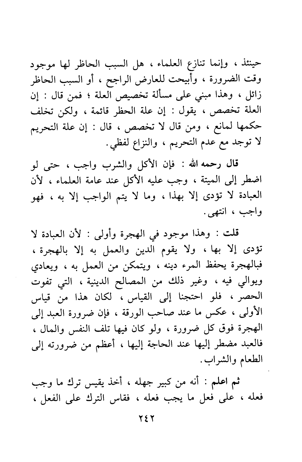 قلت: وهذا موجود في الهجرة وأولى، لأن العبادة لا تؤدى إلا بها، ولا يقوم الدين والعمل به إلا بالهجرة؛ فبالهجرة يحفظ المرء دينه، ويتمكن من العمل به، ويعادي ويوالي فيه، وغير ذلك من المصالح الدينية، التي تفوت الحصر. فلو احتجنا إلى القياس، لكان هذا من قياس الأولى، عكس ما عند صاحب الورقة، فإن ضرورة العبد إلى الهجرة فوق كل ضرورة، ولو كان فيها تلف النفس والمال، فالعبد مضطر إليها عند الحاجة إليها، أعظم من ضرورته إلى الطعام والشراب.