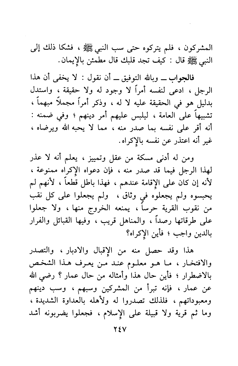 ومن له أدنى مسكة من عقل وتمييز، يعلم أنه لا عذر لهذا الرجل فيما قد صدر منه؛ فإن دعواه الإكراه ممنوعة، لأنه إن كان على الإقامة عندهم، فهذا باطل قطعاً، لأنهم لم يحبسوه ولم يجعلوه في وثاق، ولم يجعلوا على كل نقب من نقوب القرية حرساً يمنعه الخروج منها، ولا جعلوا على طرقاتها رصداً، والمناهل قريب، وفيها القبائل، والفرار بالدين واجب، فأين الإكراه؟