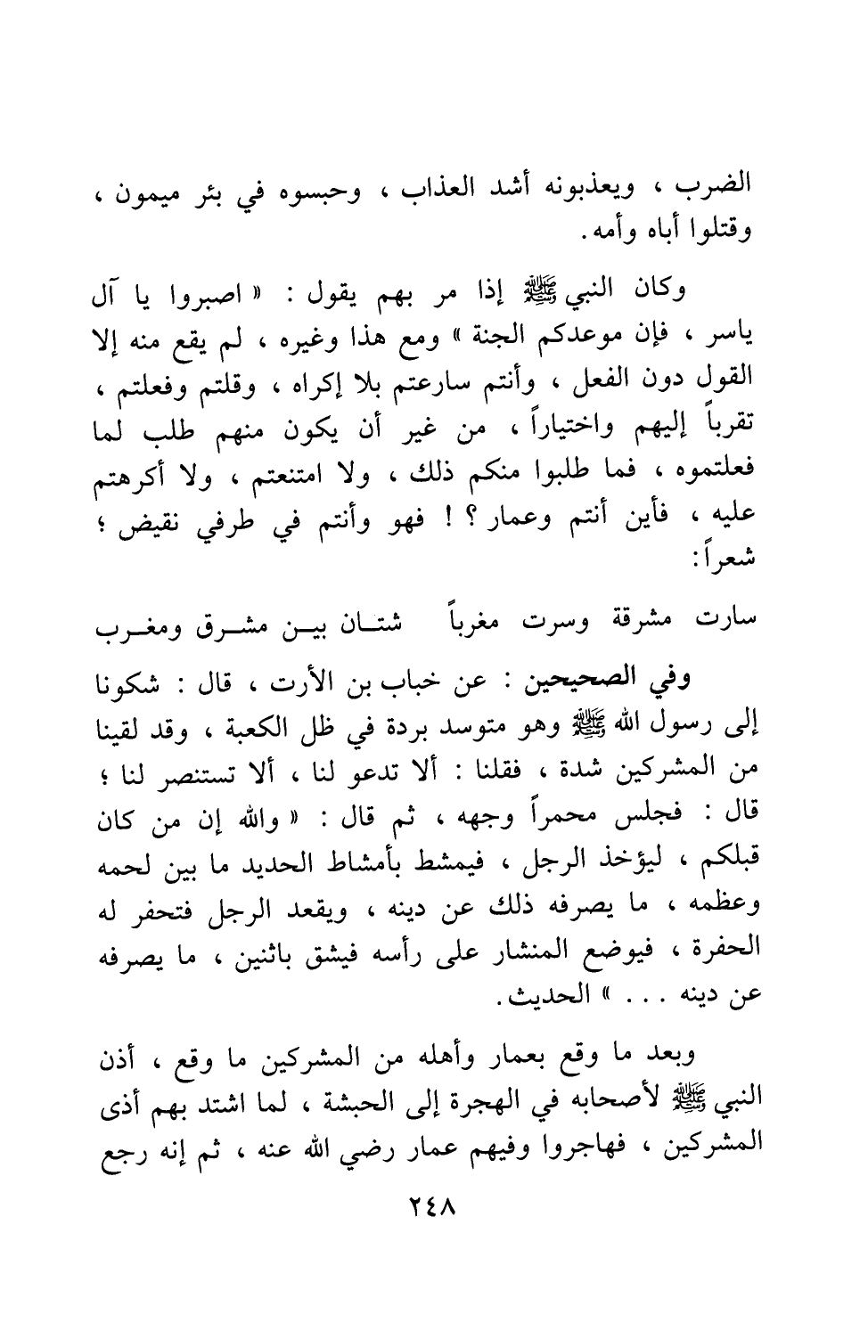وكان النبي صلى الله عليه وسلم إذا مر بهم يقول: " اصبروا يا آل ياسر، فإن موعدكم الجنة "، ومع هذا وغيره، لم يقع منه إلا القول دون الفعل. وأنتم سارعتم بلا إكراه، وقلتم وفعلتم، تقرباً إليهم واختياراً، من غير أن يكون منهم طلب لما فعلتموه، فما طلبوا منكم ذلك، ولا امتنعتم، ولا أُكرهتم عليه، فأين أنتم وعمار؟! فهو وأنتم في طرفي نقيض; شعرا:
