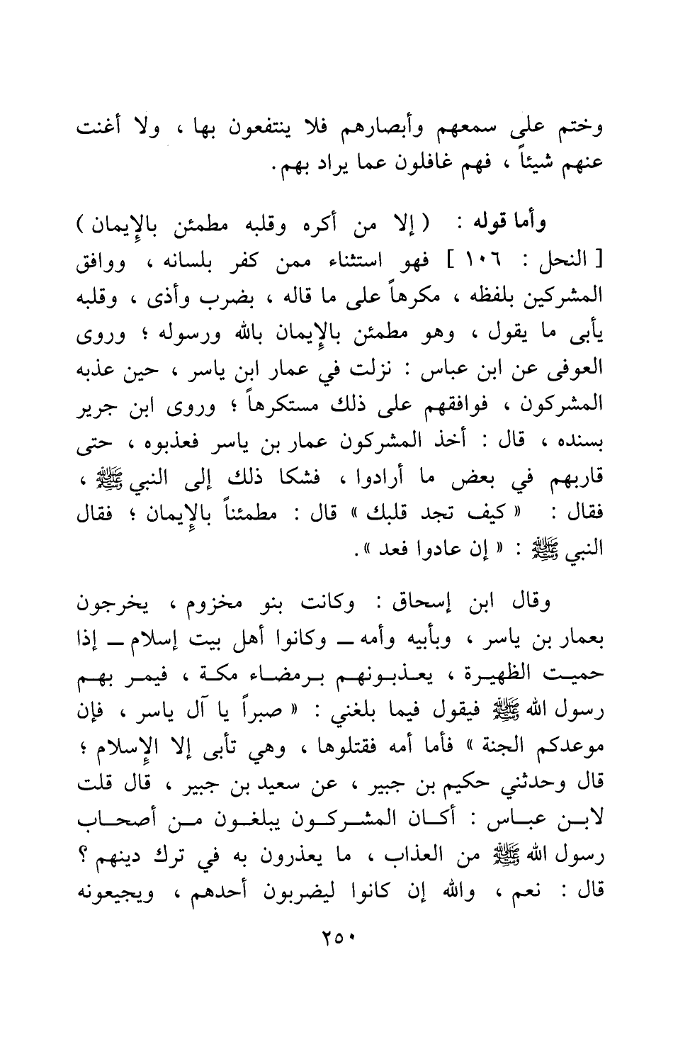 وأما قوله: {إِلَّا مَنْ أُكْرِهَ وَقَلْبُهُ مُطْمَئِنٌّ بِالْأِيمَانِ} [سورة النحل آية: 106] ، فهو استثناء ممن كفر بلسانه، ووافق المشركين بلفظه، مكرهاً على ما قاله، بضرب وأذى، وقلبه يأبى ما يقول، وهو مطمئن بالإيمان بالله ورسوله. وروى العوفي عن ابن عباس: "نزلت في عمار بن ياسر، حين عذبه المشركون، فوافقهم على ذلك مستكرهاً"، وروى ابن جرير بسنده، قال: " أخذ المشركون عمار بن ياسر فعذبوه، حتى قاربهم في بعض ما أرادوا. فشكا ذلك إلى النبي صلى الله عليه وسلم فقال: كيف تجد قلبك؟ قال: مطمئناً بالإيمان، فقال النبي صلى الله عليه وسلم: إن عادوا فعد ".