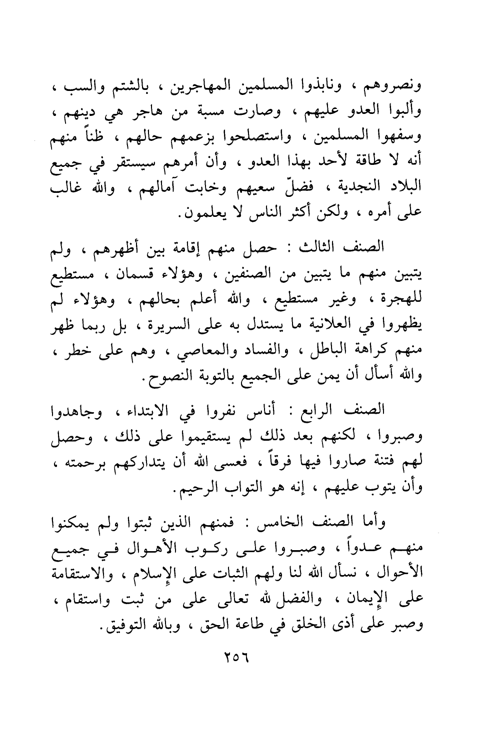 وأما الصنف الخامس: فمنهم الذين ثبتوا ولم يمكنوا منهم عدواً، وصبروا على ركوب الأهوال في جميع الأحوال؛ نسأل الله لنا ولهم الثبات على الإسلام، والاستقامة على الإيمان، والفضل لله تعالى على من ثبت واستقام، وصبر على أذى الخلق في طاعة الحق، وبالله التوفيق.
