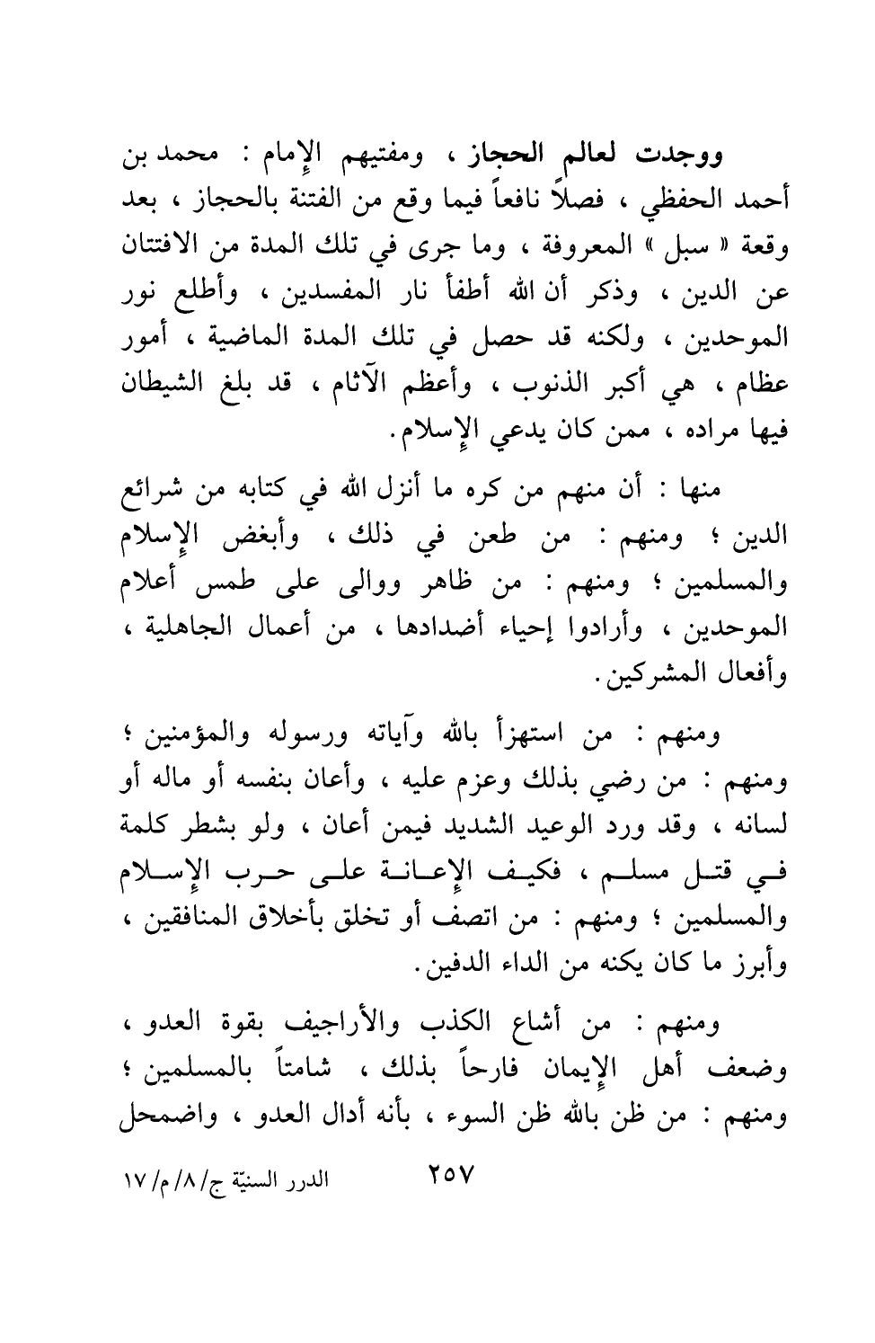 ووجدت لعالم الحجاز، ومفتيهم الإمام: محمد بن أحمد الحفظي، فصلاً نافعاً فيما وقع من الفتنة بالحجاز، بعد وقعة "سبل" المعروفة، وما جرى في تلك المدة من الافتتان عن الدين. وذكر أن الله أطفأ نار المفسدين، وأطلع نور الموحدين، ولكنه قد حصل في تلك المدة الماضية، أمور عظام، هي أكبر الذنوب، وأعظم الآثام، قد بلغ الشيطان فيها مراده، ممن كان يدعي الإسلام.