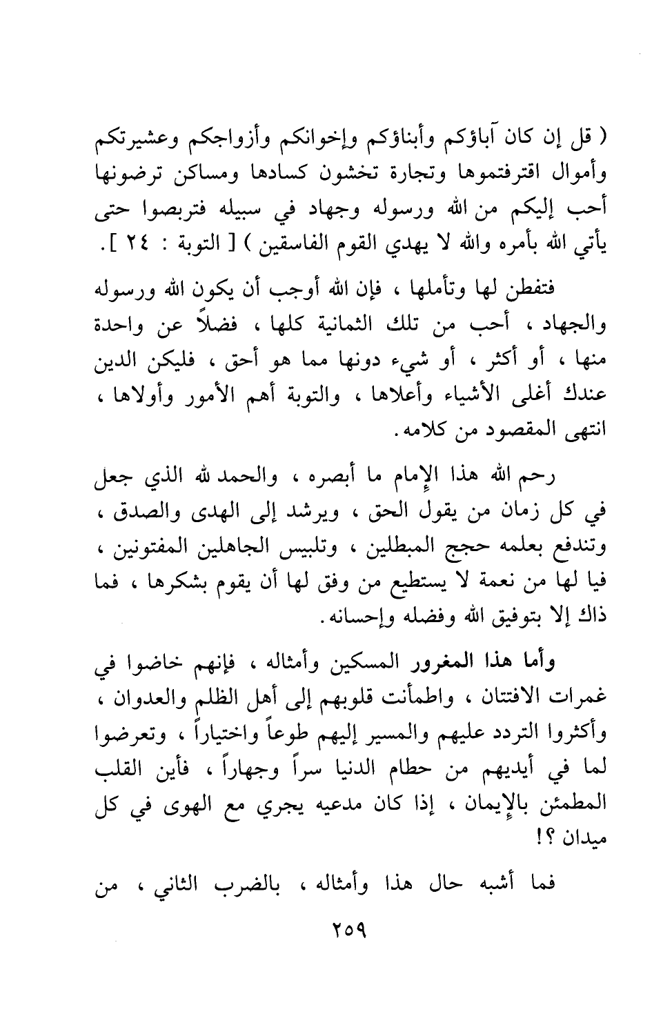 رحم الله هذا الإمام ما أبصره! والحمد لله الذي جعل في كل زمان من يقول الحق، ويرشد إلى الهدى والصدق، وتندفع بعلمه حجج المبطلين، وتلبيس الجاهلين المفتونين. فيا لها من نعمة لا يستطيع من وفق لها أن يقوم بشكرها! فما ذاك إلا بتوفيق الله وفضله وإحسانه.