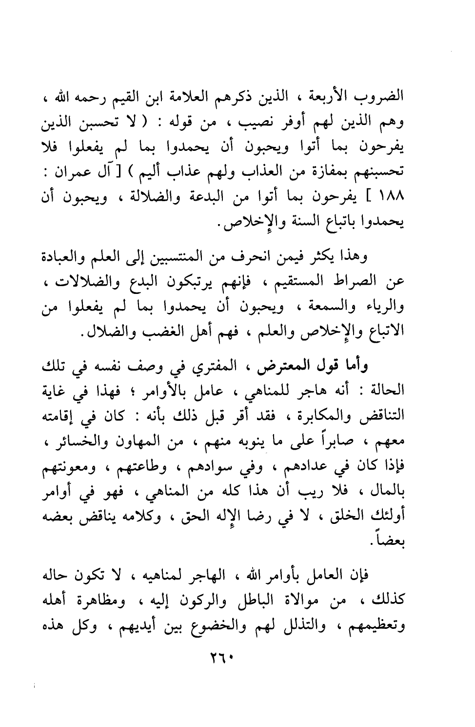 الضروب الأربعة، الذين ذكرهم العلامة ابن القيم، رحمه الله؛ وهم الذين لهم أوفر نصيب، من قوله: {لا تَحْسَبَنَّ الَّذِينَ يَفْرَحُونَ بِمَا أَتَوْا وَيُحِبُّونَ أَنْ يُحْمَدُوا بِمَا لَمْ يَفْعَلُوا فَلا تَحْسَبَنَّهُمْ بِمَفَازَةٍ مِنَ الْعَذَابِ وَلَهُمْ عَذَابٌ أَلِيمٌ} [سورة آل عمران آية: 188] ، يفرحون بما أتوا من البدعة والضلالة، ويحبون أن يحمدوا باتباع السنة والإخلاص.