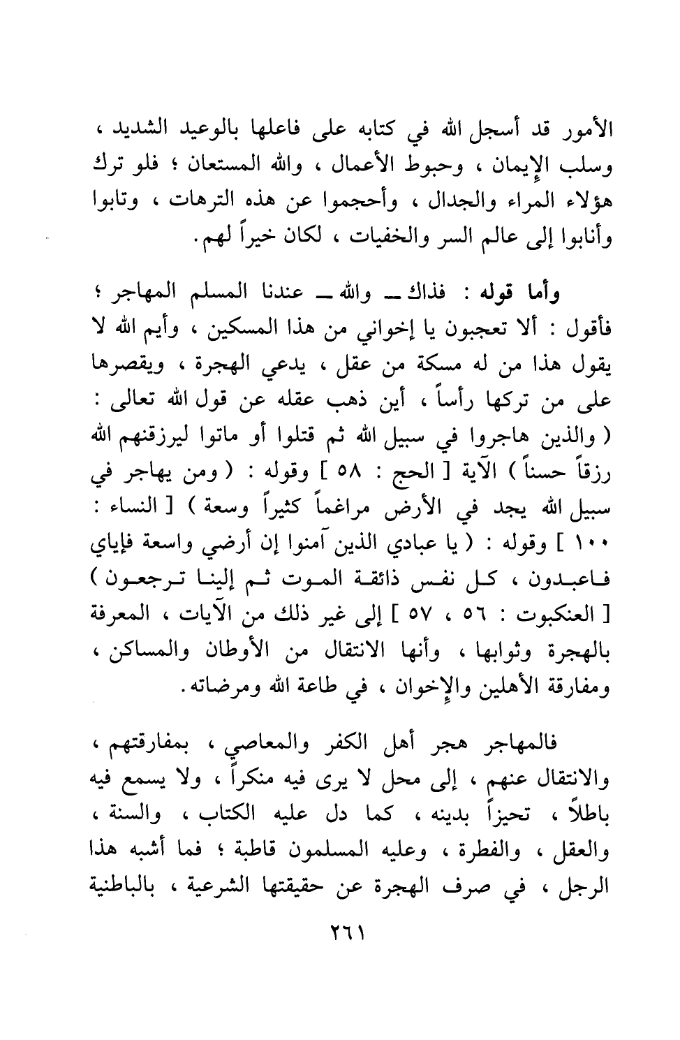 وأما قوله: فذاك- والله- عندنا المسلم المهاجر، فأقول: ألا تعجبون يا إخواني من هذا المسكين؟! وأيم الله، لا يقول هذا من له مسكة من عقل. يدعي الهجرة، ويقصرها على من تركها رأساً، أين ذهب عقله عن قول الله تعالى: {وَالَّذِينَ هَاجَرُوا فِي سَبِيلِ اللَّهِ ثُمَّ قُتِلُوا أَوْ مَاتُوا لَيَرْزُقَنَّهُمُ اللَّهُ رِزْقاً حَسَناً} الآية [سورة الحج آية: 58] ، وقوله: {وَمَنْ يُهَاجِرْ فِي سَبِيلِ اللَّهِ يَجِدْ فِي الْأَرْضِ مُرَاغَماً كَثِيراً وَسَعَةً} [سورة النساء آية: 100] ، وقوله: {يَا عِبَادِيَ الَّذِينَ آمَنُوا إِنَّ أَرْضِي وَاسِعَةٌ فَإِيَّايَ فَاعْبُدُونِ كُلُّ نَفْسٍ ذَائِقَةُ الْمَوْتِ ثُمَّ إِلَيْنَا تُرْجَعُونَ} [سورة العنكبوت آية: 56-57] ، إلى غير ذلك من الآيات، المعرفة بالهجرة وثوابها، وأنها الانتقال من الأوطان والمساكن، ومفارقة الأهلين والإخوان، في طاعة الله ومرضاته.