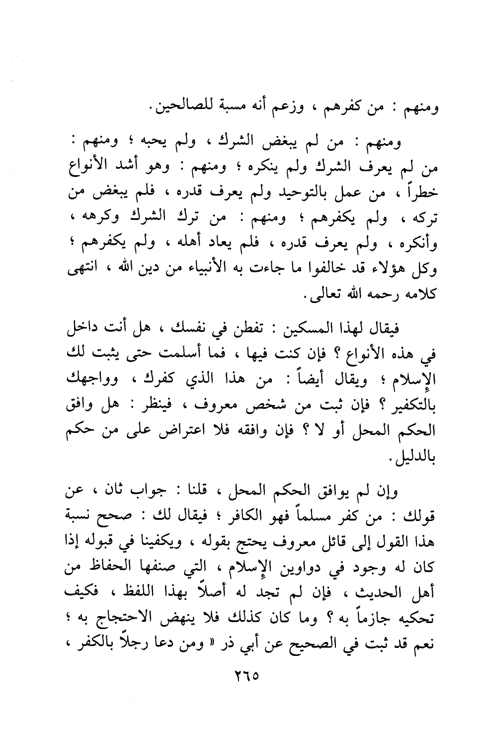 ومنهم: من لم يحب التوحيد، ولم يبغضه. ومنهم: من أنكره ولم يعاد أهله. ومنهم: من عاداهم ولم يكفّرهم. ومنهم: من كفّرهم، وزعم أنه مسبة للصالحين. ومنهم: من لم يبغض الشرك، ولم يحبه. ومنهم: من لم يعرف الشرك ولم ينكره. ومنهم: وهو أشد الأنواع خطراً: من عمل بالتوحيد ولم يعرف قدره، فلم يبغض من تركه، ولم يكفّرهم. ومنهم: من ترك الشرك وكرهه، وأنكره، ولم يعرف قدره؛ فلم يعاد أهله، ولم يكفّرهم.