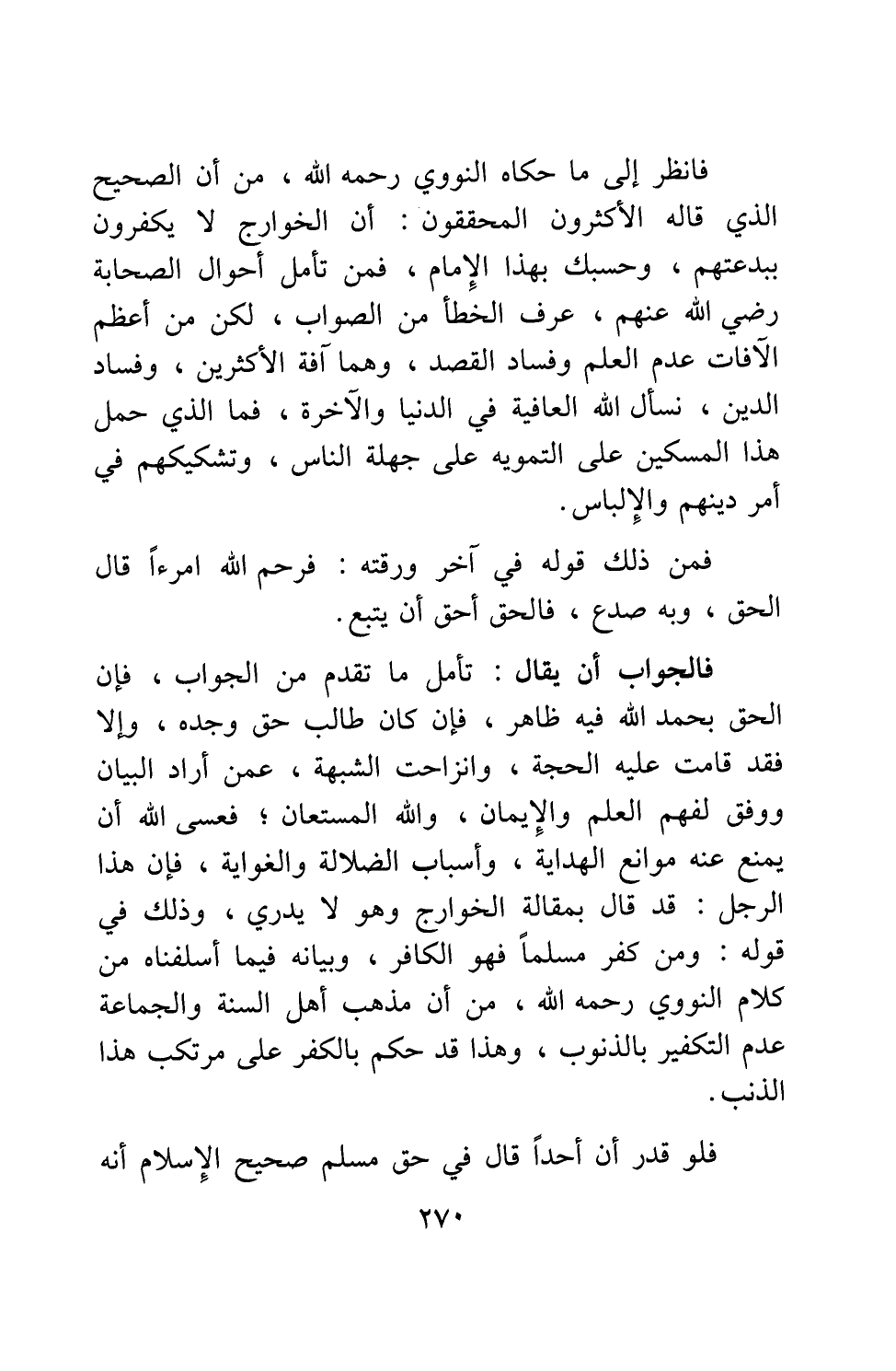 فانظر إلى ما حكاه النووي، رحمه الله، من أن الصحيح الذي قاله الأكثرون المحققون: أن الخوارج لا يكفرون ببدعتهم، وحسبك بهذا الإمام. فمن تأمل أحوال الصحابة، رضي الله عنهم، عرف الخطأ من الصواب؛ لكن من أعظم الآفات عدم العلم وفساد القصد، وهما آفة الأكثرين، وفساد الدين، نسأل الله العافية في الدنيا والآخرة. فما الذي حمل هذا المسكين على التمويه على جهلة الناس، وتشكيكهم في أمر دينهم والإلباس؟
