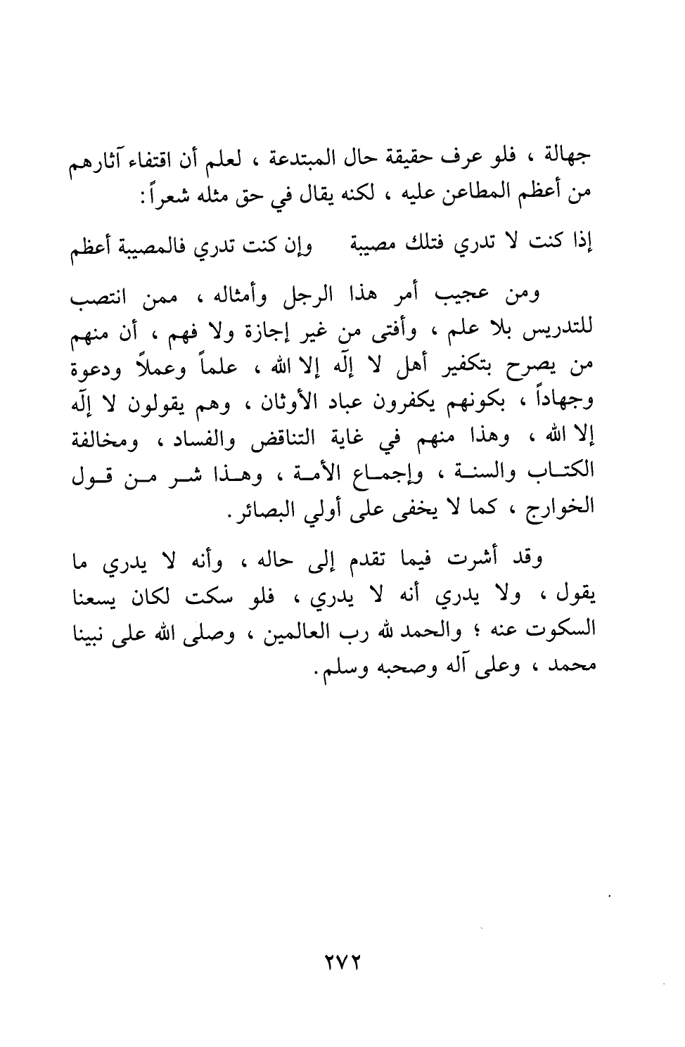 ومن عجيب أمر هذا الرجل وأمثاله، ممن انتصب للتدريس بلا علم، وأفتى من غير إجازة ولا فهم، أن منهم من يصرح بتكفير أهل لا إله إلا الله، علماً وعملاً ودعوة وجهاداً، بكونهم يكفّرون عباد الأوثان، وهم يقولون: لا إله إلا الله؛ وهذا منهم في غاية التناقض والفساد، ومخالفة الكتاب والسنة، وإجماع الأمة، وهذا شر من قول الخوارج، كما لا يخفى على أولي البصائر.