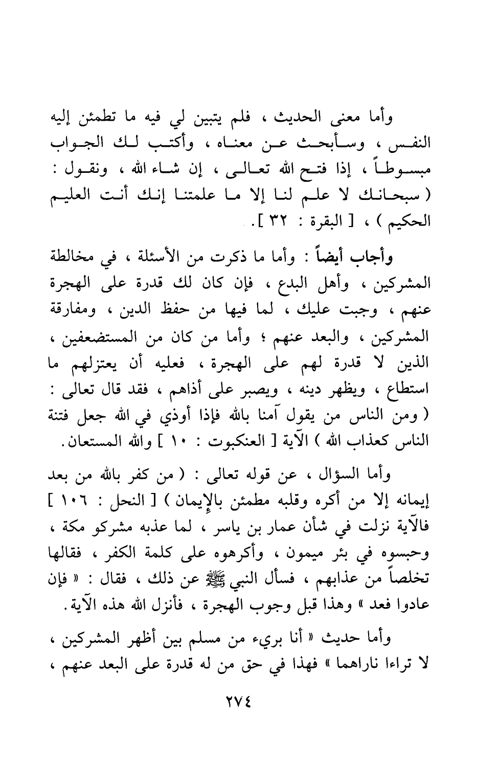 وأجاب أيضاً: وأما ما ذكرت من الأسئلة، في مخالطة المشركين، وأهل البدع، فإن كان لك قدرة على الهجرة عنهم، وجبت عليك، لما فيها من حفظ الدين، ومفارقة المشركين، والبعد عنهم، وأما من كان من المستضعفين، الذين لا قدرة لهم على الهجرة، فعليه أن يعتزلهم ما استطاع، ويظهر دينه، ويصبر على أذاهم، فقد قال تعالى: {وَمِنَ النَّاسِ مَنْ يَقُولُ آمَنَّا بِاللَّهِ فَإِذَا أُوذِيَ فِي اللَّهِ جَعَلَ فِتْنَةَ النَّاسِ كَعَذَابِ اللَّهِ} الآية [سورة العنكبوت آية: 10] ، والله المستعان.