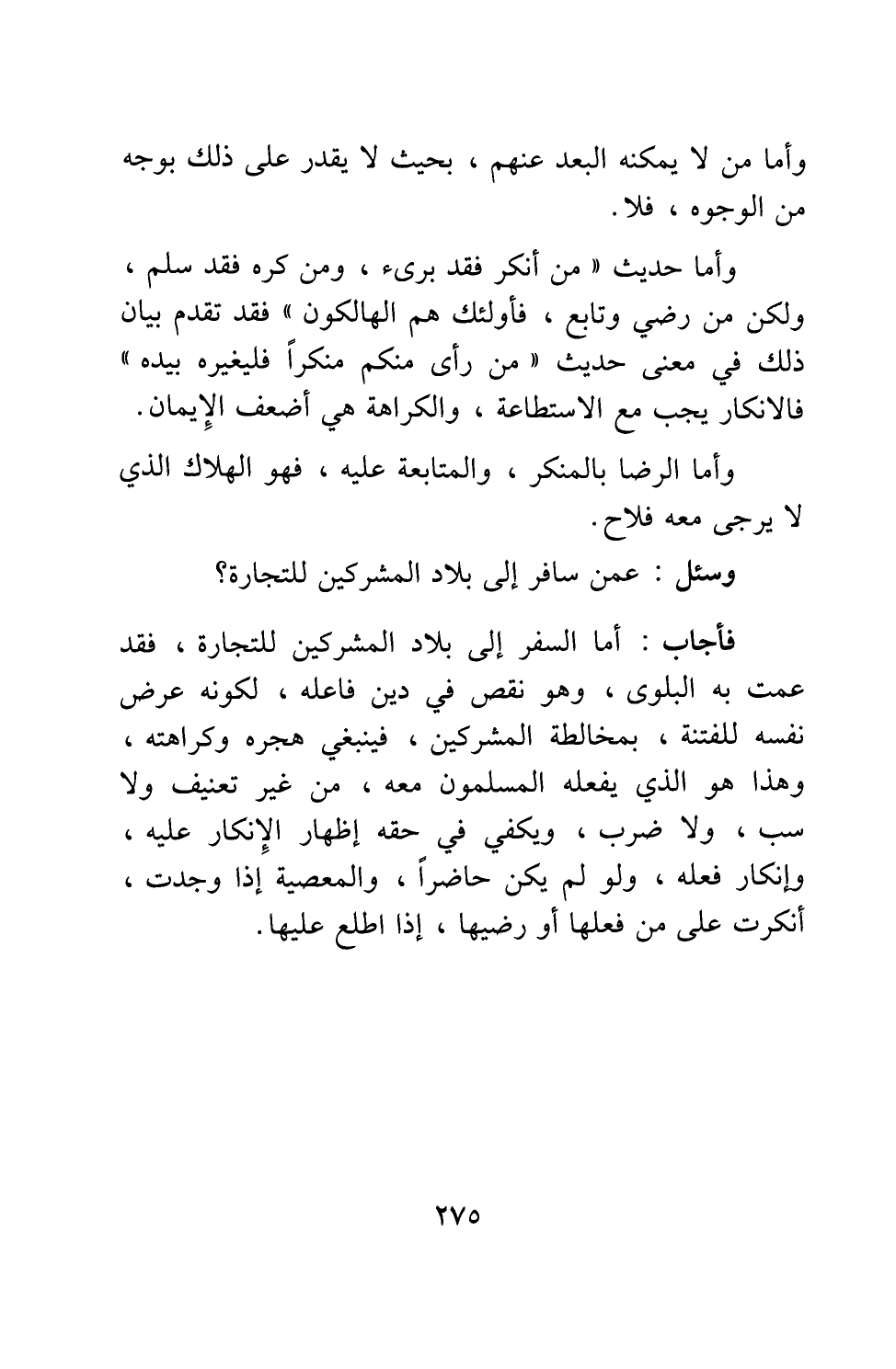 فأجاب: أما السفر إلى بلاد المشركين للتجارة، فقد عمت به البلوى، وهو نقص في دين فاعله، لكونه عرض نفسه للفتنة، بمخالطة المشركين؛ فينبغي هجره وكراهته، وهذا هو الذي يفعله المسلمون معه، من غير تعنيف ولا سب، ولا ضرب. ويكفي في حقه إظهار الإنكار عليه، وإنكار فعله، ولو لم يكن حاضراً؛ والمعصية إذا وجدت، أنكرت على من فعلها أو رضيها إذا اطلع عليها.