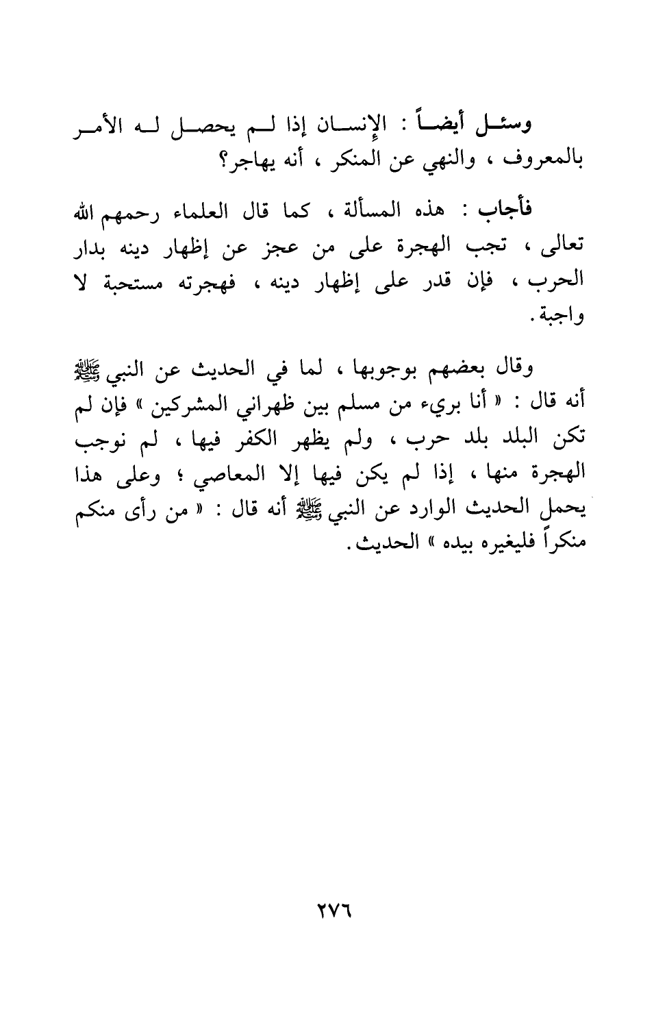 وقال بعضهم بوجوبها، لما في الحديث عن النبي صلى الله عليه وسلم أنه قال: " أنا بريء من مسلم بين ظهراني المشركين " 1. فإن لم تكن البلد بلد حرب، ولم يظهر الكفر فيها، لم نوجب الهجرة منها، إذا لم يكن فيها إلا المعاصي؛ وعلى هذا يحمل الحديث الوارد عن النبي صلى الله عليه وسلم أنه قال: " من رأى منكم منكراً فليغيره بيده " 2 الحديث.