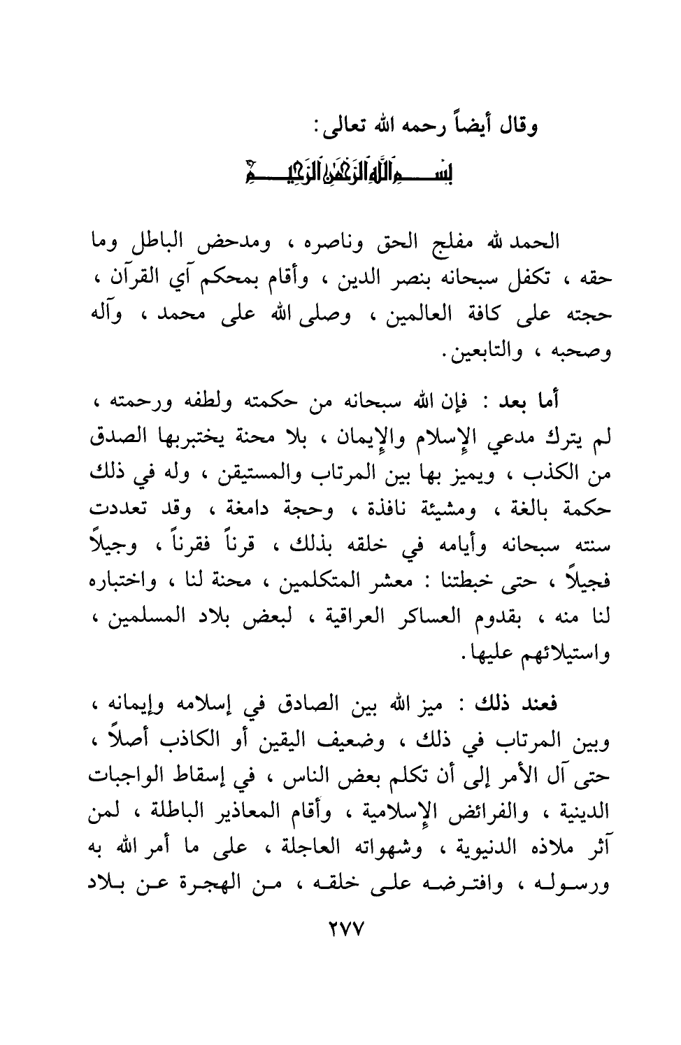 أما بعد، فإن الله سبحانه من حكمته ولطفه ورحمته، لم يترك مدعي الإسلام والإيمان، بلا محنة يختبر بها الصدق من الكذب، ويميز بها بين المرتاب والمستيقن، وله في ذلك حكمة بالغة، ومشيئة نافذة، وحجة دامغة؛ وقد تعددت سنته سبحانه وأيامه في خلقه بذلك، قرناً فقرناً، وجيلاً فجيلاً، حتى خبطتنا، معشر المتكلمين، محنة لنا، واختباره لنا منه، بقدوم العساكر العراقية، لبعض بلاد المسلمين، واستيلائهم عليها.