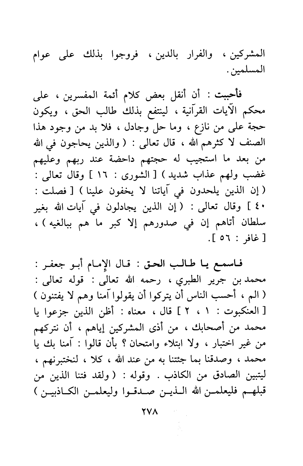 فأحببت أن أنقل بعض كلام أئمة المفسرين، على محكم الآيات القرآنية، لينتفع بذلك طالب الحق، ويكون حجة على من نازع وماحل وجادل، فلا بد من وجود هذا الصنف، لا كثّرهم الله، قال تعالى: {وَالَّذِينَ يُحَاجُّونَ فِي اللَّهِ مِنْ بَعْدِ مَا اسْتُجِيبَ لَهُ حُجَّتُهُمْ دَاحِضَةٌ عِنْدَ رَبِّهِمْ وَعَلَيْهِمْ غَضَبٌ وَلَهُمْ عَذَابٌ شَدِيدٌ} [سورة الشورى آية: 16] ، وقال تعالى: {إِنَّ الَّذِينَ يُلْحِدُونَ فِي آيَاتِنَا لا يَخْفَوْنَ عَلَيْنَا} [سورة فصلت آية: 40] ، وقال تعالى: {إِنَّ الَّذِينَ يُجَادِلُونَ فِي آيَاتِ اللَّهِ بِغَيْرِ سُلْطَانٍ أَتَاهُمْ إِنْ فِي صُدُورِهِمْ إِلَّا كِبْرٌ مَا هُمْ بِبَالِغِيهِ} [سورة غافر آية: 56] .