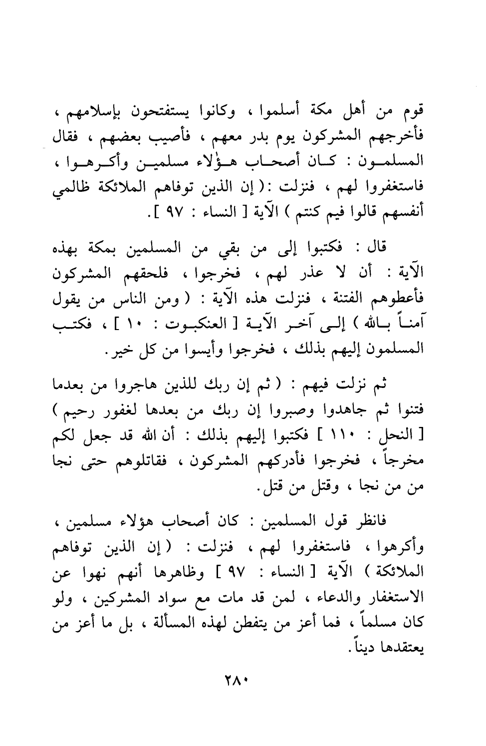 فانظر قول المسلمين: كان أصحاب هؤلاء مسلمين، وأكرهوا، فاستغفروا لهم، فنزلت: {إِنَّ الَّذِينَ تَوَفَّاهُمُ الْمَلائِكَةُ} الآية [سورة النساء آية: 97] ، وظاهرها أنهم نهوا عن الاستغفار والدعاء، لمن قد مات مع سواد المشركين، ولو كان مسلماً. فما أعز من يتفطن لهذه المسألة! بل ما أعز من يعتقدها ديناً!