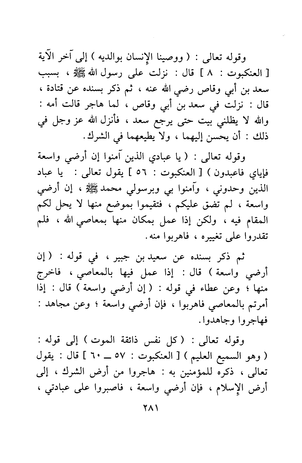 ثم ذكر بسنده عن سعيد بن جبير، في قوله: {إِنَّ أَرْضِي وَاسِعَةٌ} [سورة العنكبوت آية: 56] ، قال: إذا عمل فيها بالمعاصي، فاخرج منها. وعن عطاء في قوله: {إِنَّ أَرْضِي وَاسِعَةٌ} [سورة العنكبوت آية: 56] ، قال: إذا أمرتم بالمعاصي فاهربوا، فإن أرضي واسعة. وعن مجاهد: فهاجروا وجاهدوا.