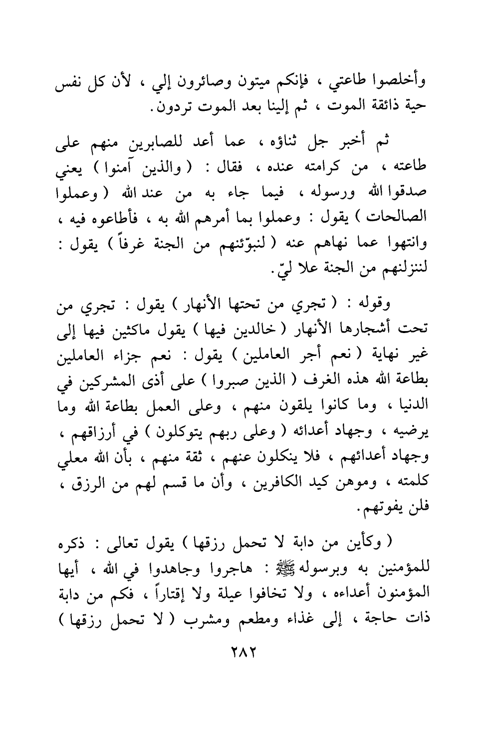 وقوله: {تَجْرِي تَحْتَهَا الْأَنْهَارُ} [سورة العنكبوت آية: 58] ، يقول: تجري من تحت أشجارها الأنهار، {خَالِدِينَ فِيهَا} ، يقول: ماكثين فيها إلى غير نهاية. {نِعْمَ أَجْرُ الْعَامِلِينَ} [سورة العنكبوت آية: 58] ، يقول: نعم جزاء العاملين بطاعة الله هذه الغرف. {الَّذِينَ صَبَرُوا} [سورة العنكبوت آية: 59] على أذى المشركين في الدنيا وما كانوا يلقون منهم، وعلى العمل بطاعة الله وما يرضيه، وجهاد أعدائه، {وَعَلَى رَبِّهِمْ يَتَوَكَّلُونَ} [سورة العنكبوت آية: 59] في أرزاقهم، وجهاد أعدائه؛ فلا ينكلون عنهم، ثقة منهم بأن الله معلي كلمته، وموهن كيد الكافرين، وأن ما قسم لهم من الرزق، فلن يفوتهم. {وَكَأَيِّنْ مِنْ دَابَّةٍ لا تَحْمِلُ رِزْقَهَا} [سورة العنكبوت آية: 60] ، يقول تعالى ذكره للمؤمنين به وبرسوله صلى الله عليه وسلم: هاجروا وجاهدوا في الله، أيها المؤمنون، أعداءه، ولا تخافوا عيلة ولا إقتاراً، فكم من دابة ذات حاجة إلى غذاء ومطعم ومشرب، {لا تَحْمِلُ رِزْقَهَا} [سورة العنكبوت آية: 60] ،