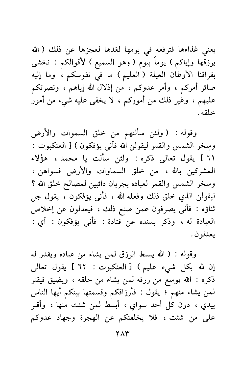 وقوله: {وَلَئِنْ سَأَلْتَهُمْ مَنْ خَلَقَ السَّمَاوَاتِ وَالْأَرْضَ وَسَخَّرَ الشَّمْسَ وَالْقَمَرَ لَيَقُولُنَّ اللَّهُ فَأَنَّى يُؤْفَكُونَ} [سورة العنكبوت آية: 61] ، يقول تعالى ذكره: ولئن سألت يا محمد، هؤلاء المشركين بالله، مَن خلق السماوات والأرض فسواهن، وسخر الشمس والقمر لعباده يجريان دائبين لمصالح خلق الله؟ ليقولن: الذي خلق ذلك وفعله: الله. فأنى يؤفكون؟ يقول جل ثناؤه: فأنى يصرفون عمن صنع ذلك، فيعدلون عن إخلاص العبادة له؟ وذكر بسنده عن قتادة: {فَأَنَّى يُؤْفَكُونَ} : أي: يعدلون.