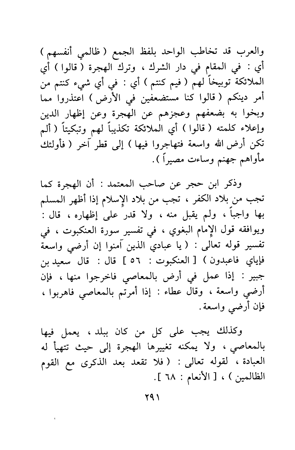وذكر ابن حجر عن صاحب المعتمد: أن الهجرة كما تجب من بلاد الكفر تجب من بلاد الإسلام، إذا أظهر المسلم بها واجباً ولم يقبل منه، ولا قدر على إظهاره. قال: ويوافقه قول الإمام البغوي في تفسير سورة العنكبوت، في تفسير قوله تعالى: {يَا عِبَادِيَ الَّذِينَ آمَنُوا إِنَّ أَرْضِي وَاسِعَةٌ فَإِيَّايَ فَاعْبُدُونِ} [سورة العنكبوت آية: 56] ، قال: قال سعيد بن جبير: "إذا عمل في أرض بالمعاصي فاخرجوا منها، فإن أرضي واسعة"، وقال عطاء: "إذا أُمرتم بالمعاصي فاهربوا، فإن أرضي واسعة". وكذلك يجب على كل من كان ببلد، يُعمل فيها بالمعاصي ولا يمكنه تغييرها، الهجرة إلى حيثما تتهيأ له العبادة، لقوله تعالى {فَلا تَقْعُدْ بَعْدَ الذِّكْرَى مَعَ الْقَوْمِ الظَّالِمِينَ} [سورة الأنعام آية: 68] .