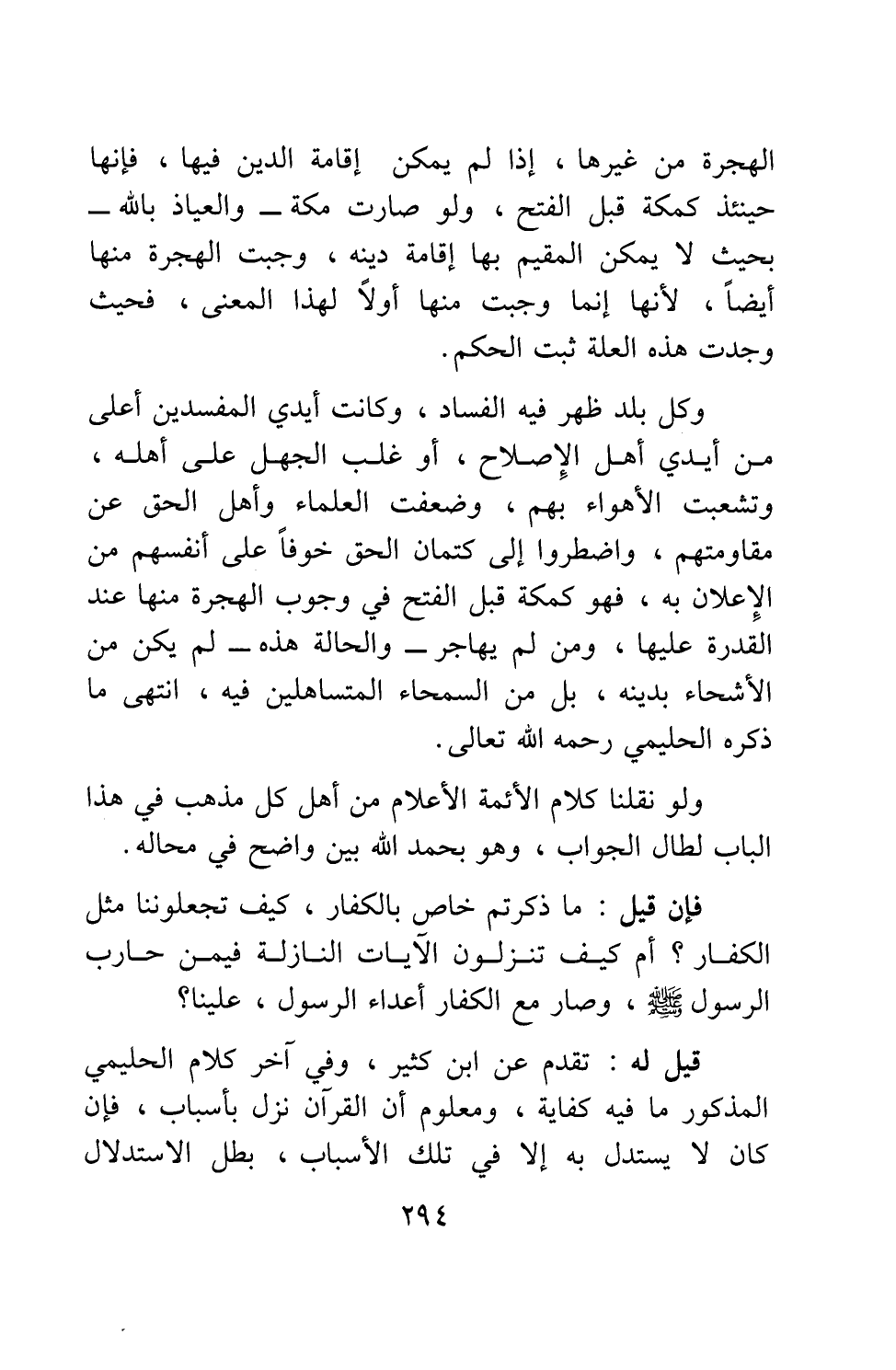 الهجرة من غيرها، إذا لم يمكن إقامة الدين فيها، فإنها حينئذ كمكة قبل الفتح، ولو صارت مكة - والعياذ بالله - بحيث لا يمكن المقيم بها إقامة دينه، وجبت الهجرة منها أيضاً، لأنها إنما وجبت منها أولاً لهذا المعنى؛ فحيث وجدت هذه العلة ثبت الحكم. وكل بلد ظهر فيه الفساد، وكانت أيدي المفسدين أعلى من أيدي أهل الإصلاح، أو غلب الجهل على أهله، وتشعبت الأهواء بهم، وضعفت العلماء وأهل الحق عن مقاومتهم، واضطروا إلى كتمان الحق خوفاً على أنفسهم من الإعلان به، فهو كمكة قبل الفتح في وجوب الهجرة منها عند القدرة عليها؛ ومن لم يهاجر - والحالة هذه - لم يكن من الأشحاء بدينه، بل من السمحاء المتساهلين فيه. انتهى ما ذكره الحليمي، رحمه الله تعالى.
