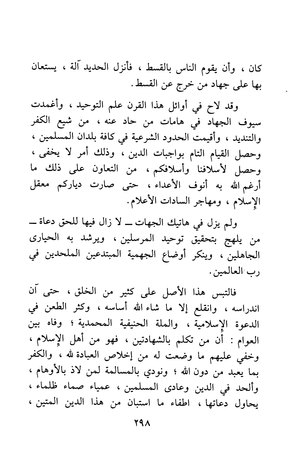 وقد لاح في أوائل هذا القرن علم التوحيد، وأغمدت سيوف الجهاد في هامات من حاد عنه، من شيع الكفر والتنديد، وأقيمت الحدود الشرعية في كافة بلدان المسلمين، وحصل القيام التام بواجبات الدين، وذلك أمر لا يخفى، وحصل لأسلافنا وأسلافكم، من التعاون على ذلك ما أرغم الله به أنوف الأعداء، حتى صارت دياركم معقل الإسلام، ومهاجر السادات الأعلام.