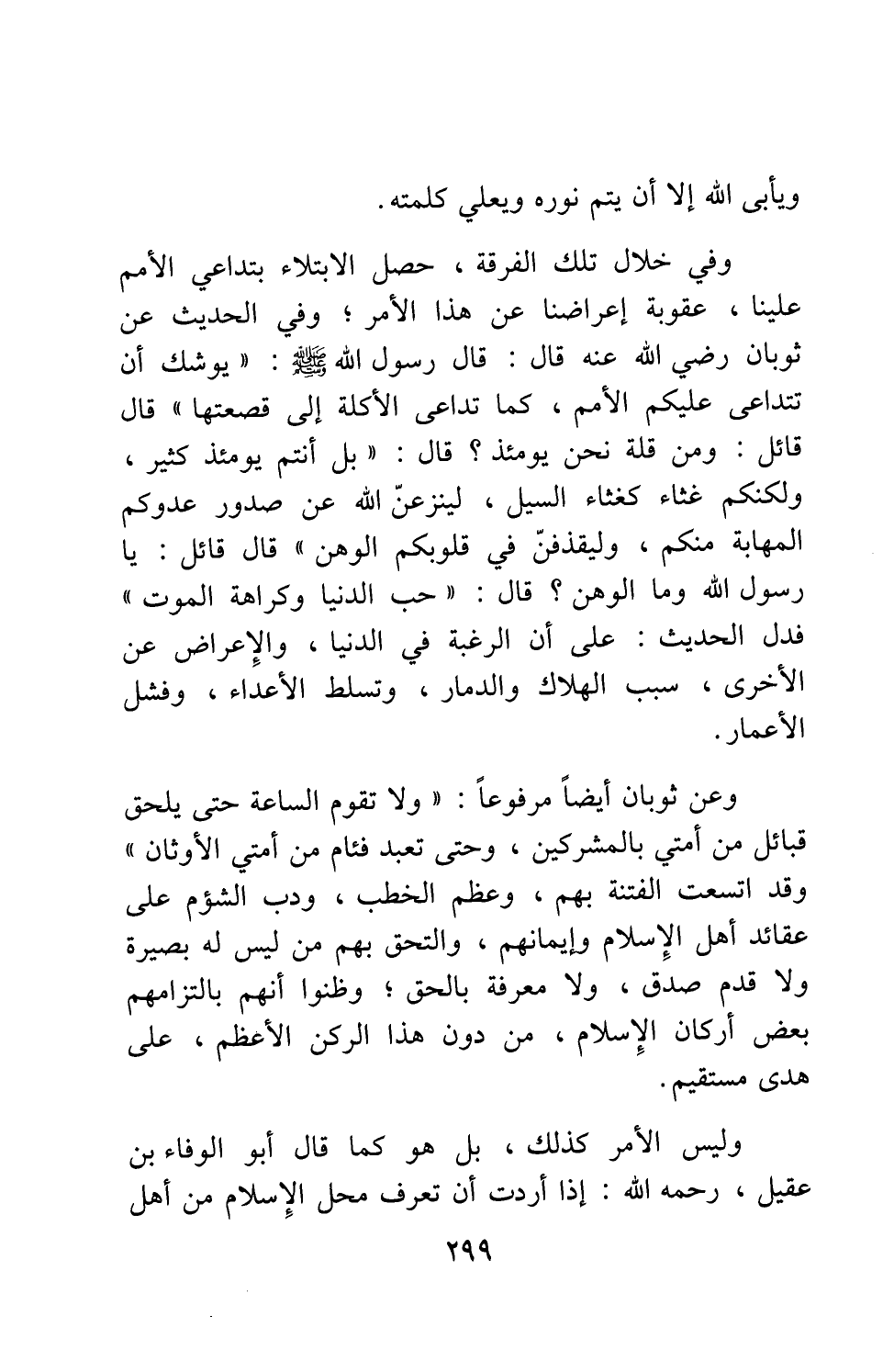 وعن ثوبان أيضاً مرفوعاً: "ولا تقوم الساعة حتى يلحق قبائل من أمتي بالمشركين، وحتى تعبد فئام من أمتي الأوثان " 1. وقد اتسعت الفتنة بهم، وعظم الخطب، ودب الشوم على عقائد أهل الإسلام وإيمانهم، والتحق بهم من ليس له بصيرة ولا قدم صدق، ولا معرفة بالحق، وظنوا أنهم بالتزامهم بعض أركان الإسلام، من دون هذا الركن الأعظم، على هدى مستقيم. وليس الأمر كذلك، بل هو كما قال أبو الوفاء ابن عقيل، رحمه الله: إذا أردت أن تعرف محل الإسلام من أهل