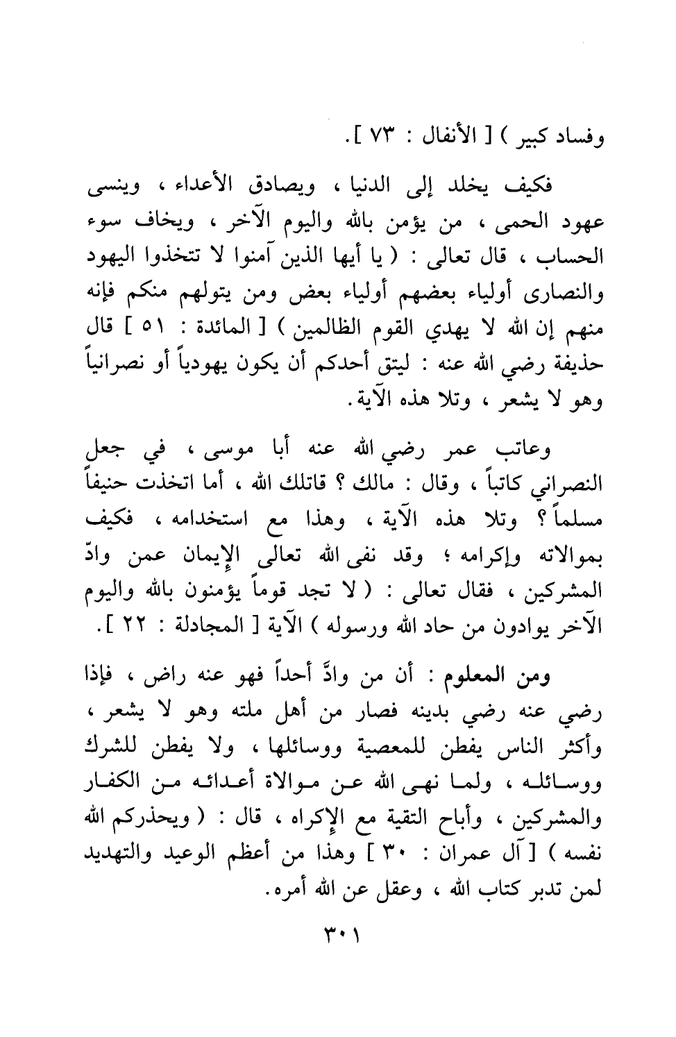 فكيف يخلد إلى الدنيا، ويصادق الأعداء، وينسى عهود الحمى، من يؤمن بالله واليوم الآخر، ويخاف سوء الحساب، قال تعالى: {يَا أَيُّهَا الَّذِينَ آمَنُوا لا تَتَّخِذُوا الْيَهُودَ وَالنَّصَارَى أَوْلِيَاءَ بَعْضُهُمْ أَوْلِيَاءُ بَعْضٍ وَمَنْ يَتَوَلَّهُمْ مِنْكُمْ فَإِنَّهُ مِنْهُمْ إِنَّ اللَّهَ لا يَهْدِي الْقَوْمَ الظَّالِمِينَ} [سورة المائدة آية: 51] . قال حذيفة رضي الله عنه: "ليتق أحدكم أن يكون يهودياً أو نصرانياً وهو لا يشعر"، وتلا هذه الآية. وعاتب عمر رضي الله عنه أبا موسى، في جعل النصراني كاتباً، وقال: "ما لك؟ قاتلك الله! أما اتخذت حنيفاً مسلماً؟ "، وتلا هذه الآية، وهذا مع استخدامه، فكيف بموالاته وإكرامه؟! وقد نفى الله تعالى الإيمان عمن وادّ المشركين، فقال تعالى: {لا تَجِدُ قَوْماً يُؤْمِنُونَ بِاللَّهِ وَالْيَوْمِ الْآخِرِ يُوَادُّونَ مَنْ حَادَّ اللَّهَ وَرَسُولَهُ} الآية [سورة المجادلة آية: 22] .