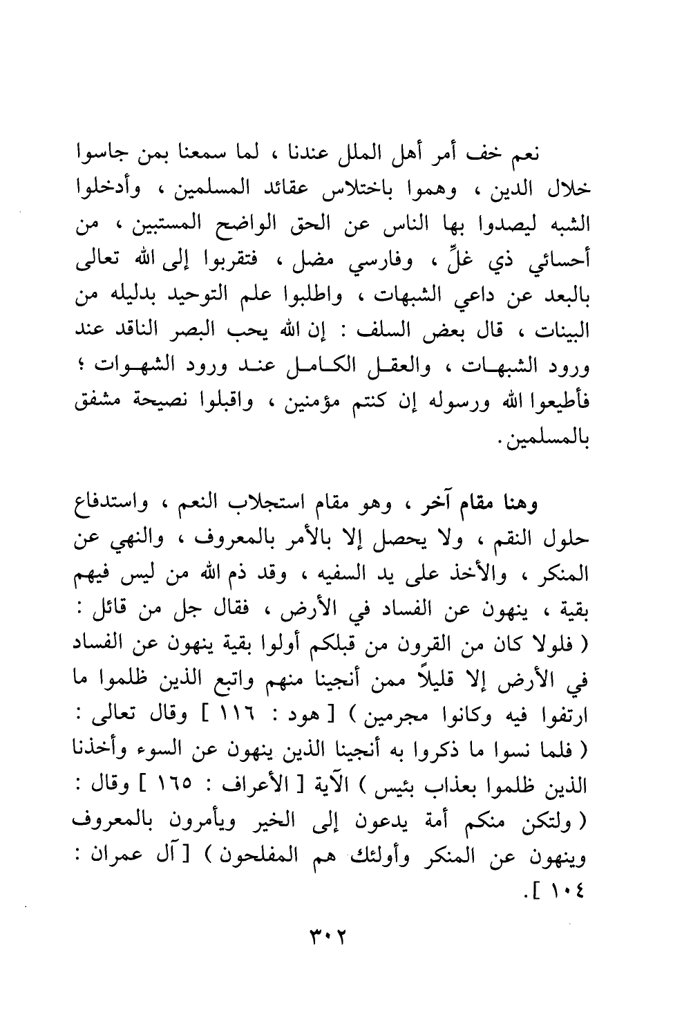 وهنا مقام آخر، وهو مقام استجلاب النعم، واستدفاع حلول النقم، ولا يحصل إلا بالأمر بالمعروف، والنهي عن المنكر، والأخذ على يد السفيه. وقد ذم الله من ليس فيهم بقية ينهون عن الفساد في الأرض، فقال جل من قائل: {فَلَوْلا كَانَ مِنَ الْقُرُونِ مِنْ قَبْلِكُمْ أُولُو بَقِيَّةٍ يَنْهَوْنَ عَنِ الْفَسَادِ فِي الْأَرْضِ إِلَّا قَلِيلاً مِمَّنْ أَنْجَيْنَا مِنْهُمْ وَاتَّبَعَ الَّذِينَ ظَلَمُوا مَا أُتْرِفُوا فِيهِ وَكَانُوا مُجْرِمِينَ} [سورة هود آية: 116] ، وقال تعالى: {فَلَمَّا نَسُوا مَا ذُكِّرُوا بِهِ أَنْجَيْنَا الَّذِينَ يَنْهَوْنَ عَنِ السُّوءِ وَأَخَذْنَا الَّذِينَ ظَلَمُوا بِعَذَابٍ بَئِيسٍ} الآية [سورة الأعراف آية: 165] ، وقال: {وَلْتَكُنْ مِنْكُمْ أُمَّةٌ يَدْعُونَ إِلَى الْخَيْرِ وَيَأْمُرُونَ بِالْمَعْرُوفِ وَيَنْهَوْنَ عَنِ الْمُنْكَرِ وَأُولَئِكَ هُمُ الْمُفْلِحُونَ} [سورة آل عمران آية: 104] .