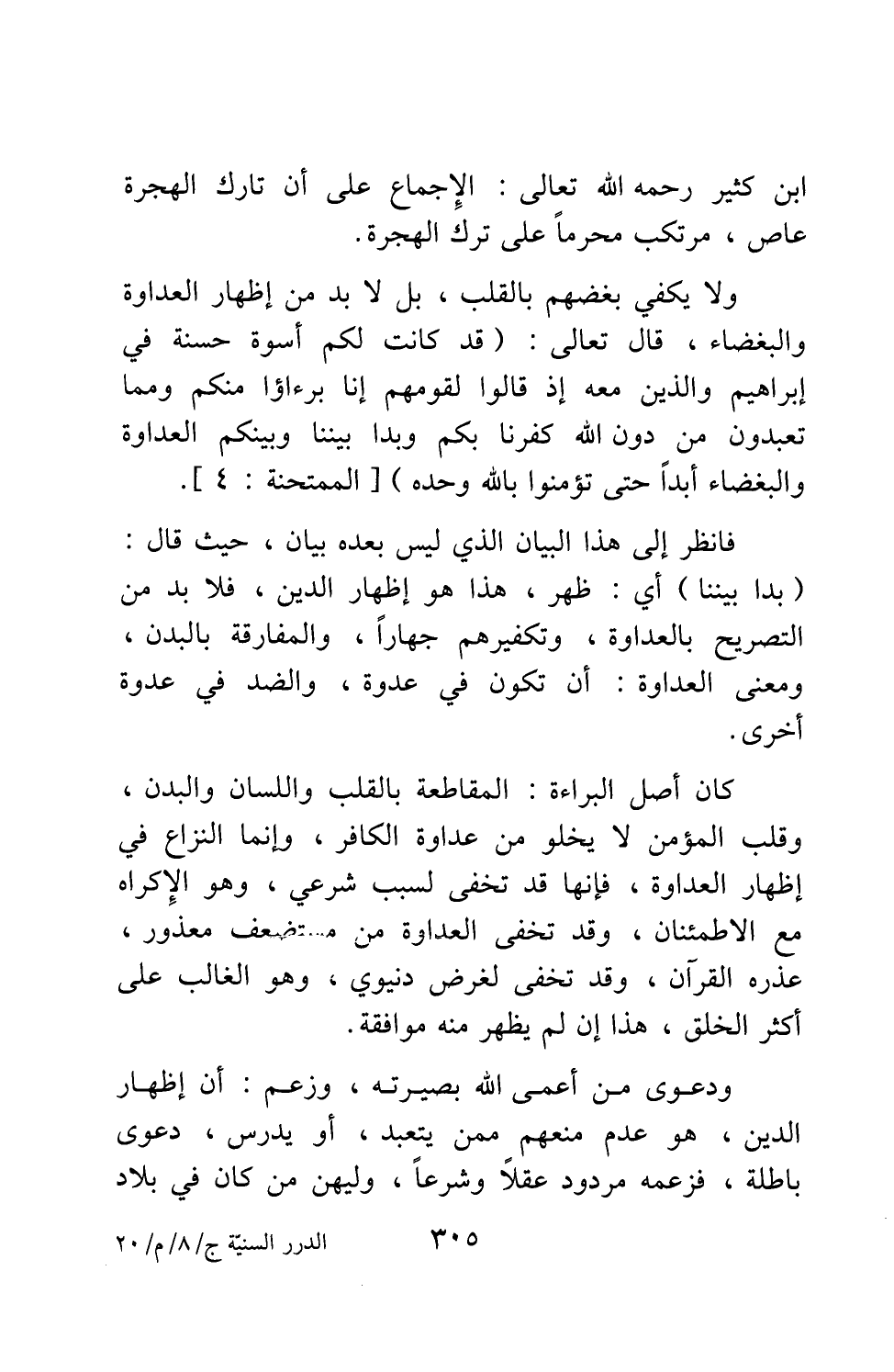 ابن كثير، رحمه الله تعال،: الإجماع على أن تارك الهجرة عاص، مرتكب محرماً على ترك الهجرة. ولا يكفي بغضهم بالقلب، بل لا بد من إظهار العداوة والبغضاء، قال تعالى: {قَدْ كَانَتْ لَكُمْ أُسْوَةٌ حَسَنَةٌ فِي إِبْرَاهِيمَ وَالَّذِينَ مَعَهُ إِذْ قَالُوا لِقَوْمِهِمْ إِنَّا بُرَآءُ مِنْكُمْ وَمِمَّا تَعْبُدُونَ مِنْ دُونِ اللَّهِ كَفَرْنَا بِكُمْ وَبَدَا بَيْنَنَا وَبَيْنَكُمُ الْعَدَاوَةُ وَالْبَغْضَاءُ أَبَداً حَتَّى تُؤْمِنُوا بِاللَّهِ وَحْدَهُ} [سورة الممتحنة آية: 4] .
