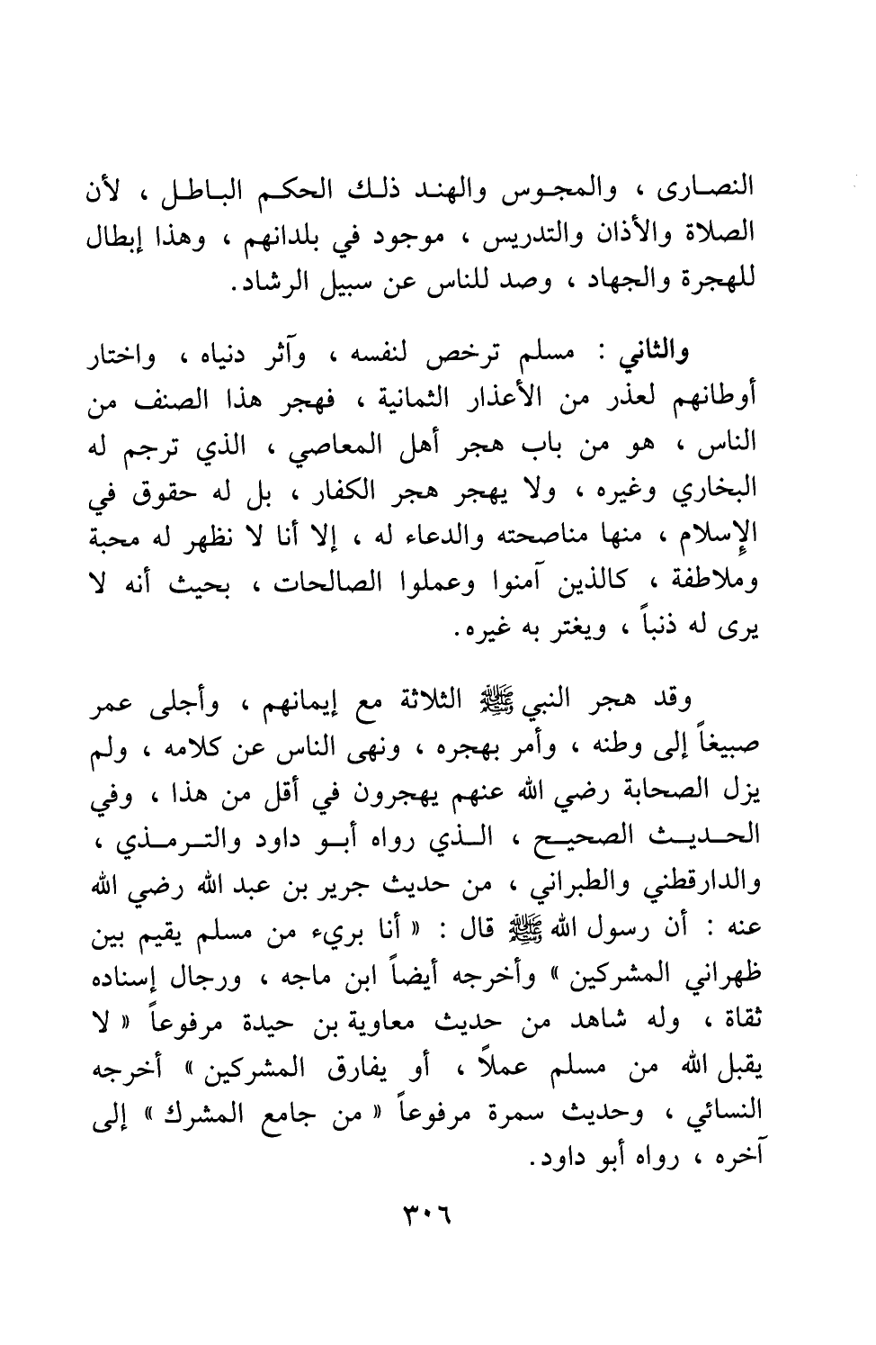 وقد هجر النبي صلى الله عليه وسلم الثلاثة، مع إيمانهم، وأجلى عمر صبيغاً إلى وطنه، وأمر بهجره، ونهى الناس عن كلامه. ولم يزل الصحابة، رضي الله عنهم، يهجرون في أقل من هذا. وفي الحديث الصحيح الذي رواه أبو داود والترمذي، والدارقطني والطبراني، من حديث جرير بن عبد الله رضي الله عنه، أن رسول الله صلى الله عليه وسلم قال: " أنا بريء من مسلم يقيم بين ظهراني المشركين " 1، وأخرجه أيضا ابن ماجة، ورجال إسناده ثقاة، وله شاهد من حديث معاوية بن حيدة مرفوعاً: "لا يقبل الله من مسلم عملاً، أو يفارق المشركين"، أخرجه النسائي، وحديث سمرة مرفوعاً: " من جامع المشرك ... إلخ"، رواه أبو داود.