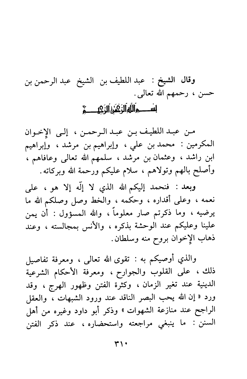 من عبد اللطيف بن عبد الرحمن، إلى الإخوان المكرمين: محمد بن علي، وإبراهيم بن مرشد، وإبراهيم بن راشد، وعثمان بن مرشد، سلمهم الله تعالى وعافاهم، وأصلح بالهم وتولاهم؛ سلام عليكم ورحمة الله وبركاته.