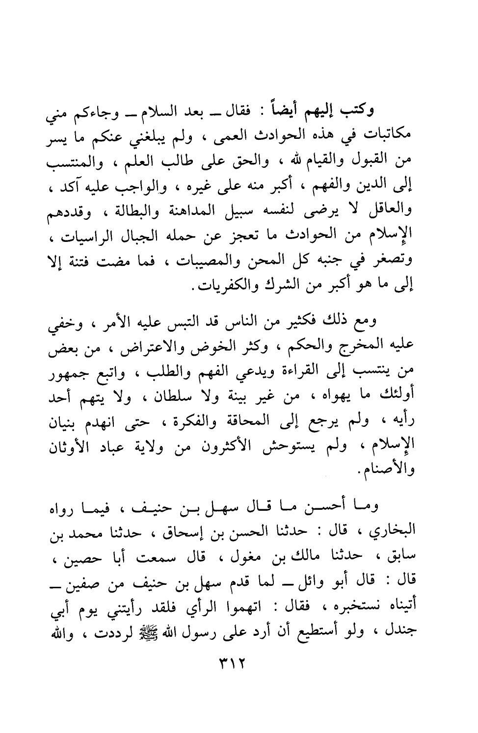 وما أحسن ما قال سهل بن حنيف، فيما رواه البخاري، قال: حدثنا الحسن بن إسحاق، حدثنا محمد بن سابق، حدثنا مالك بن مغول، قال: سمعت أبا حصين قال: قال أبو وائل: "لما قدم سهل بن حنيف من صفين أتيناه نستخبره، فقال: اتهموا الرأي. فلقد رأيتني يوم أبي جندل، ولو أستطيع أن أرد على رسول الله صلى الله عليه وسلم لرددت، والله